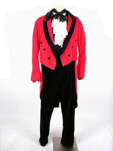 From New York Costume Designer Frankie Steinz:"Ring Master"; Black velvet pants; Black satin dress shirt; Black Vest; White Lace collar with Black ribbon tie; Red Tuxedo Coat with long tails; Black top hat; Black leather whip
