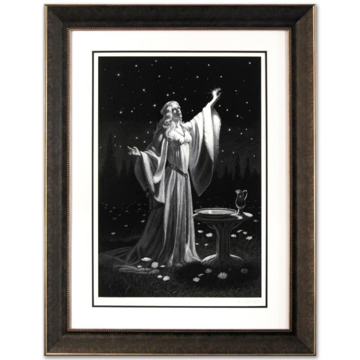 Known world wide for his fantasy and science fiction illustrations, Greg Hildebrandt has created an abundance of fascinating artwork including, and most notably his illustration work for J.R.R. Tolkien's 'The Hobbit' and 'Lord of the Rings'. "Ring Of Galadriel", originally created in the 1970's for Ballantine Books, is a limited edition giclee on paper, numbered and hand signed by Greg Hildebrandt! This piece comes custom framed using acid free and archival materials and is ready to hang. Includes Certificate of Authenticity! Measures approx. 33" x 43.5" (with frame), 19.5" x 30" (image). Reference #: 189893