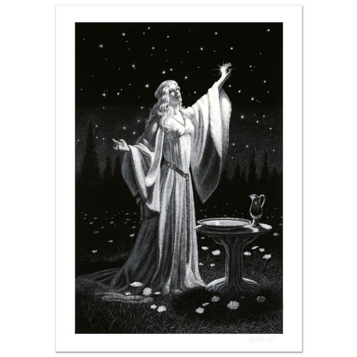 Known world wide for his fantasy and science fiction illustrations, Greg Hildebrandt has created an abundance of fascinating artwork including, and most notably his illustration work for J.R.R. Tolkien's 'The Hobbit' and 'Lord of the Rings'. "Ring Of Galadriel", originally created in the 1970's for Ballantine Books, is a limited edition giclee on paper, numbered and hand signed by Greg Hildebrandt! Includes Certificate of Authenticity! Measures approx. 24" x 34" (with border), 20" x 30" (image). Reference #: 193673.