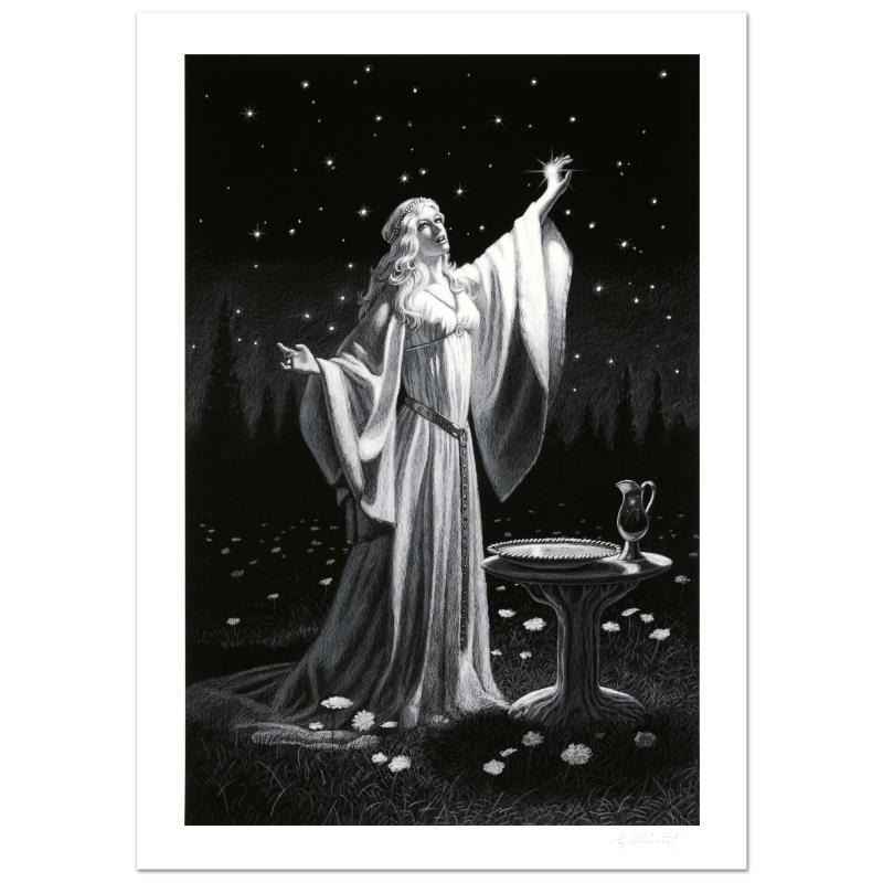 Known world wide for his fantasy and science fiction illustrations, Greg Hildebrandt has created an abundance of fascinating artwork including, and most notably his illustration work for J.R.R. Tolkien's 'The Hobbit' and 'Lord of the Rings'. "Ring Of Galadriel", originally created in the 1970's for Ballantine Books, is a limited edition giclee on paper, numbered and hand signed by Greg Hildebrandt! Includes Certificate of Authenticity! Measures approx. 24" x 34" (with border), 20" x 30" (image).