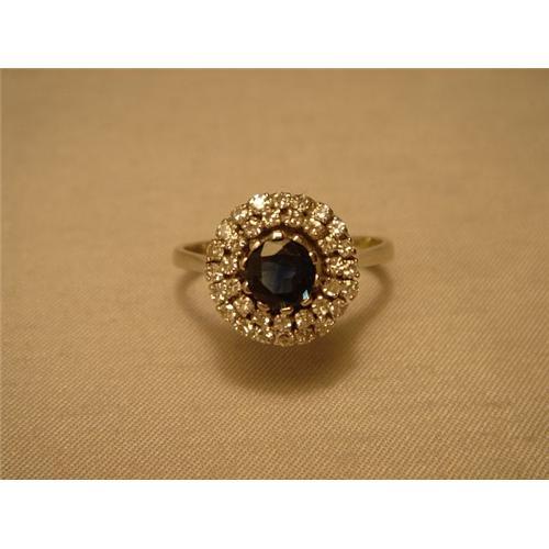 This is a beautiful ring made out of 18ct. white gold,a medium / dark blue Saphire and with 38 small but sparkly Diamonds. The Saphires are all set around the Saphire forming a wonderful cluster!The Diamonds are S 1 tinted white and total .38 ct.It was made in Germany in the 60s.The design, quality and condition are good.The ring really sparkles when it is on your finger, it will cause a whole lot of admiration!! Superb value for money!