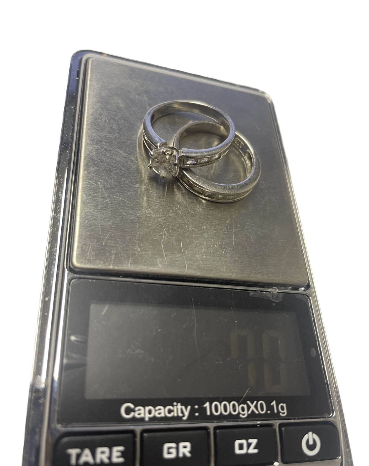 together they weigh 7 g. The smaller stones are diamonds, the largest one is not.