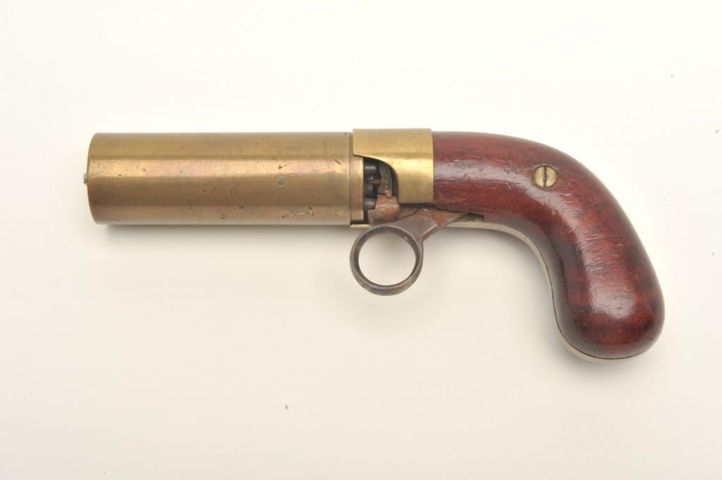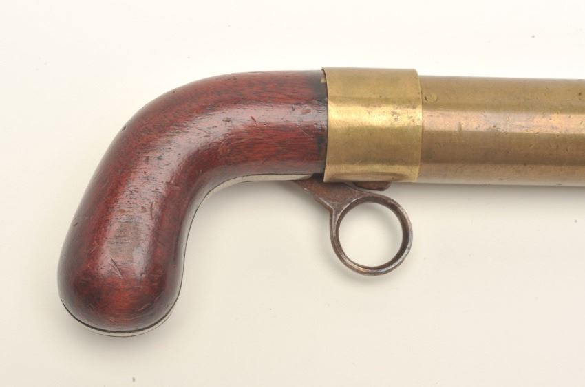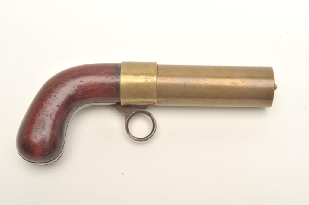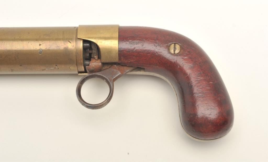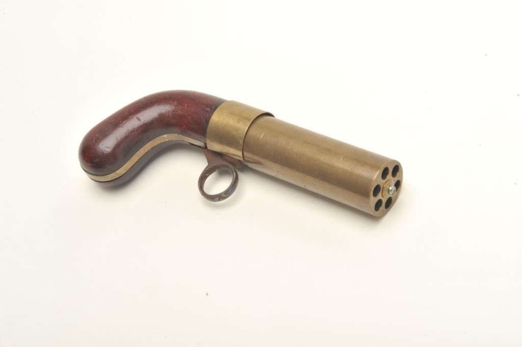 Ring Trigger Revolving Barrel Percussion Pistol by J.P. Ferrell .25 caliber, with 3.5" six shot revolving barrel cluster. The muzzle of each barrel has a one through six punch dots. The ring trigger engages therevolving barrel and operates a unique underhammer device. The brass backstrap is engraved J.P. Ferrell Maker, and again, J.P. Ferrell Maker No. Bridgewater (st. or rd.). Wood dogleg grips. The brass is nice andshiny, however the hammer device and ring trigger are slightly oxidizes and do not function consistently. Est:$500-700