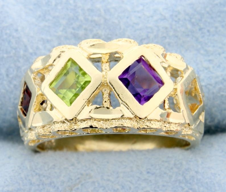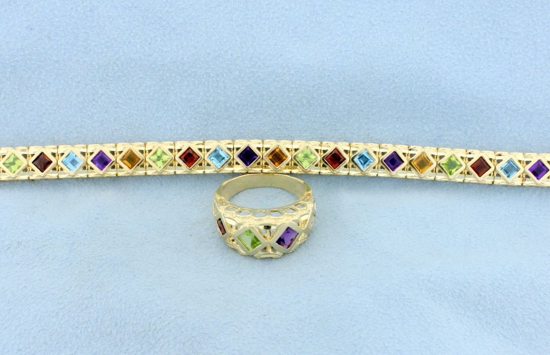 Beautiful ring and bracelet matching set both in 14k yellow gold with Square Cut Gemstones. The gemstones are 4.5m x 4.5mm and include Amethyst, Peridot, Citrine, Garnet, and Topaz. There are 24 gems in the bracelet that total approximately 10 carats! The matching ring carries approximately 2.50 carats of gemstones. This is a stunning set and in fantastic condition. Ring is size 8 1/2. Bracelet measures 7 1/8" long. 23.3g total weight