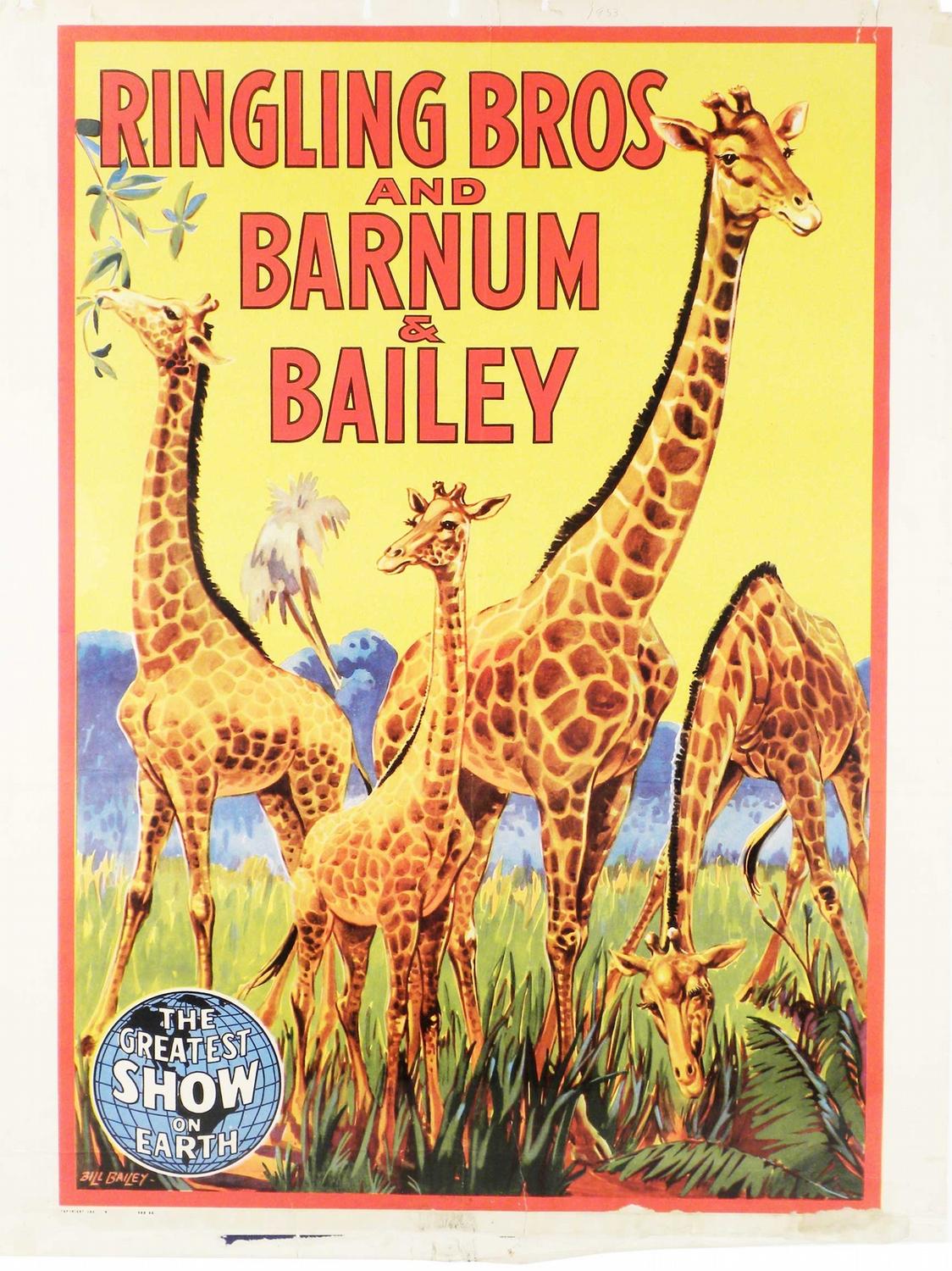 Ringling Bros. and Barnum & Bailey Circus Poster. Depicting giraffes. "The Greatest Show on Earth". Paper loss, fold creased and staining otherwise good condition. 21 X 28 inches.