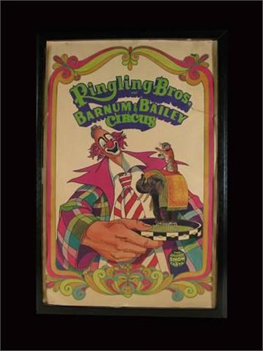 Ringling Bros and Barnum and Baily Circus 1940's poster depicting clown, tape residue on bottom, 6 inches tear at 3:00, 24 inches x 36 inches.