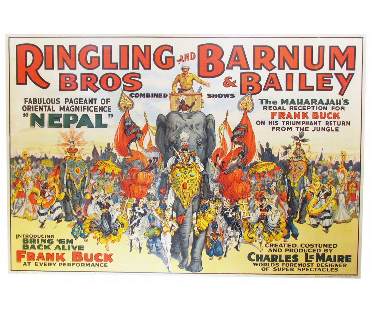 Ringling Bros and Barnum & Bailey Circus Poster. Combined shows. Fabulous Pageant of "Nepal" and The Maharajah's regal reception for Frank Buck. Strong color and graphics. The Strobridge Litho Co. No. 3814. Some staining at bottom edge. Professional conservation on linen. 39 1/2 X 27 inches.