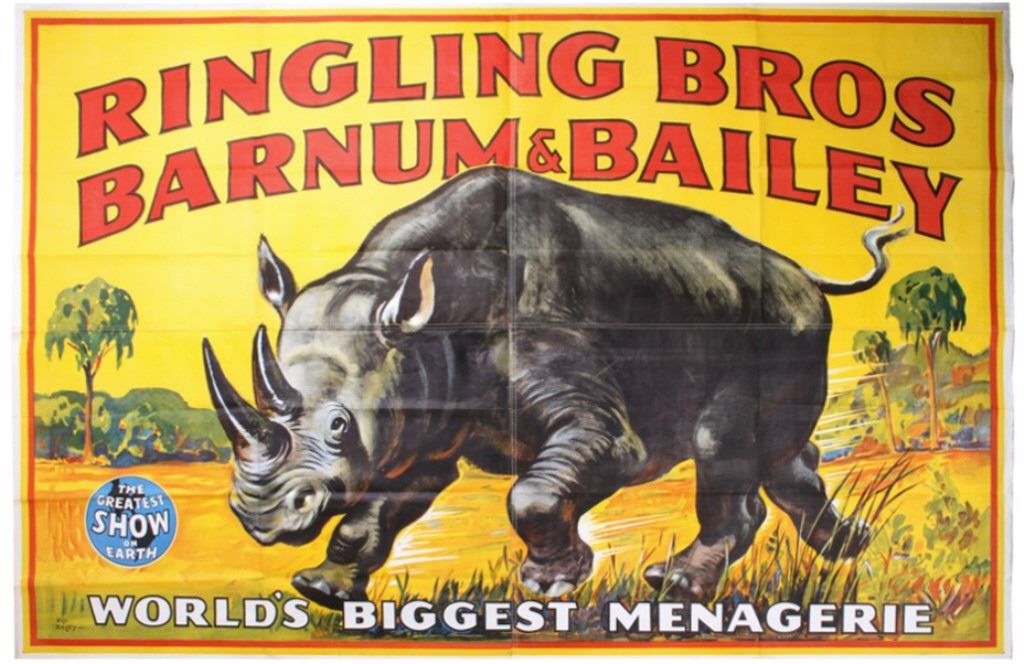 This is an original authentic Ringling Brothers Barnum & Bailey "World's Biggest Menagerie" Charging Rhino Canvas Linen Banner from circa 1947. The piece is possibly from the John Nickolas Ringling family estate of the Ringling Brothers Circus in Ringling, Montana. The early original piece shows a fantastic charging Rhino and reads, “Ringling Bros Barnum & Bailey - World's Biggest Menagerie – The Greatest Show On Earth (in an earth like artwork)”. The piece also shows the name of the prolific artist, Bill Bailey, one of the finest Circus Poster Litho makers. This is one of the finest large examples of the rare original Charging Rhino Ringling Brother Circus Canvas Banner known to exist with vibrant colors and graphics. John Ringling was the most well-known of the Ringling Brothers and had the town of Ringling, Montana named after him. He was the President of the White Sulphur Springs & Yellowstone Park Railroad. The banner measures 79“H x 117.5“L (with white edge). The piece can be folded down to measure 10.25”x30.75” and 3/8” thick for shipping. The piece is a 9 Sheet Litho Canvas Poster. Very rare to be a litho on canvas as most all of the available pieces were on paper.