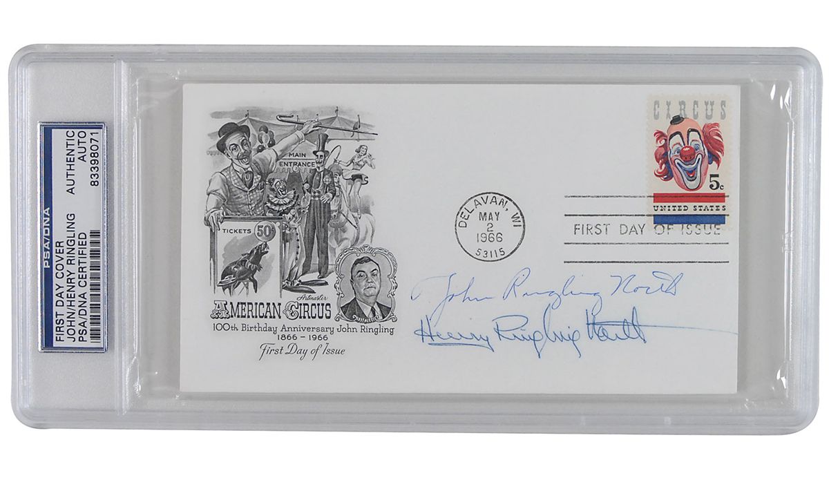 FDC with a cachet honoring the American circus, signed in blue ink, “John Ringling North” and “Henry Ringling North.” Encapsulated in a plastic PSA/DNA authentication holder. In fine condition.