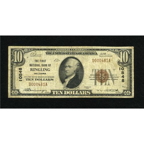 <B>Ringling, OK</B></I> - $10 1929 Ty. 1 <B>The First NB</B></I> Ch. # 10548<BR>The margins are broad and the evenly circulated paper is uncompromised. <B>Very Good-Fine.</B></I><BR><BR><b>Shipping:</b> Coins & Currency (<a target="_blank" href="http://www.heritageauctions.com/common/shipping.php">view shipping information</a>)