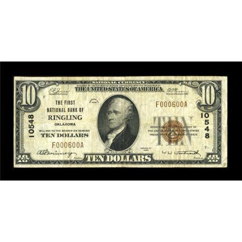 <B>Ringling, OK</B></I> - $10 1929 Ty. 1 <B>The First NB</B></I> Ch. # 10548<BR> An attractive piece from the sole bank to issue in this small Jefferson County community. <B>Fine+.</B></I><BR><BR><b>Shipping:</b> Coins & Currency (<a target="_blank" href="http://www.heritageauctions.com/common/shipping.php">view shipping information</a>)