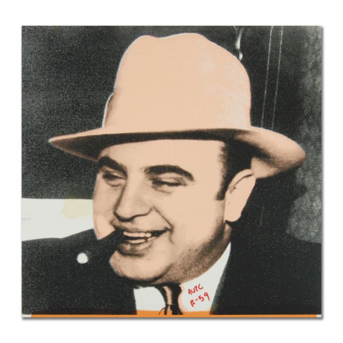 "Al Capone" is a one-of-a-kind hand-pulled silkscreen and mixed media painting on canvas by Ringo. This piece is hand signed by the artist and comes from the Andy Warhol Legacy Series. Includes Certificate of Authenticity. Due to the nature of the canvas, these pieces will need to be mounted for framing. Measures approx. 16" x 16" (image). ** Please note: There is a patch of ink (artifact of printing process) above Capone's cigar in the white area. ** Reference #: 229147
