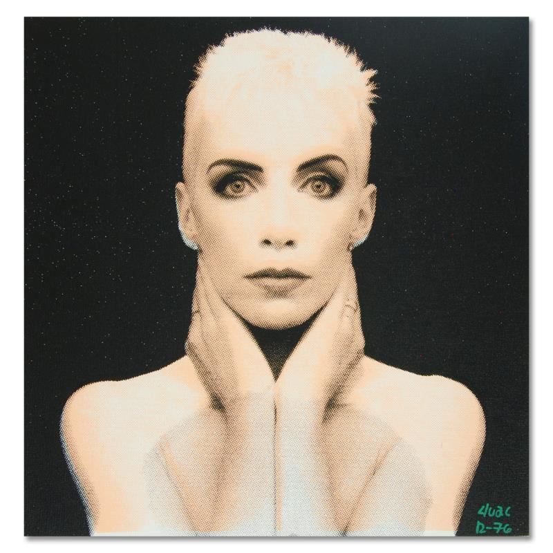 "Annie Lennox" is a one-of-a-kind hand-pulled silkscreen and mixed media painting on canvas by Ringo - protege of Andy Warhol's apprentice, Steve Kaufman. This piece is hand signed by the artist and Includes Certificate of Authenticity. This piece comes from the Andy Warhol Legacy Series. Due to the nature of the canvas these, pieces will need to be mounted for framing. Measures approx. 15" x 15" (image).