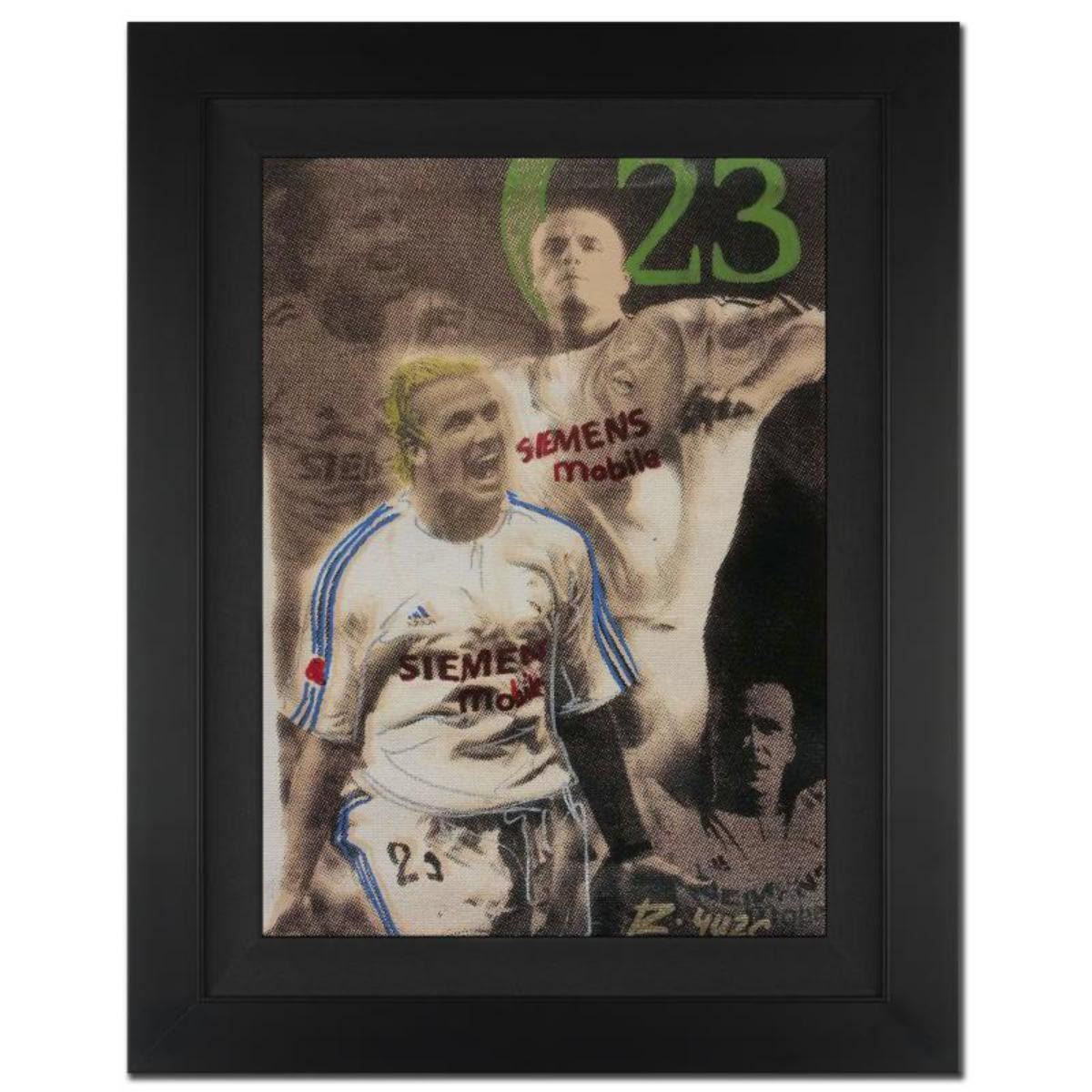 "David Beckham Pop Stamp" is a one-of-a-kind hand-pulled silkscreen and mixed media painting on canvas by Ringo (Daniel Funes) - protege of Andy Warhol's apprentice, Steve Kaufman! This piece is hand signed by the artist and Includes Certificate of Authenticity! Measures approx. 16" x 21" (with frame); 11" x 16" (image). Reference #: 217765