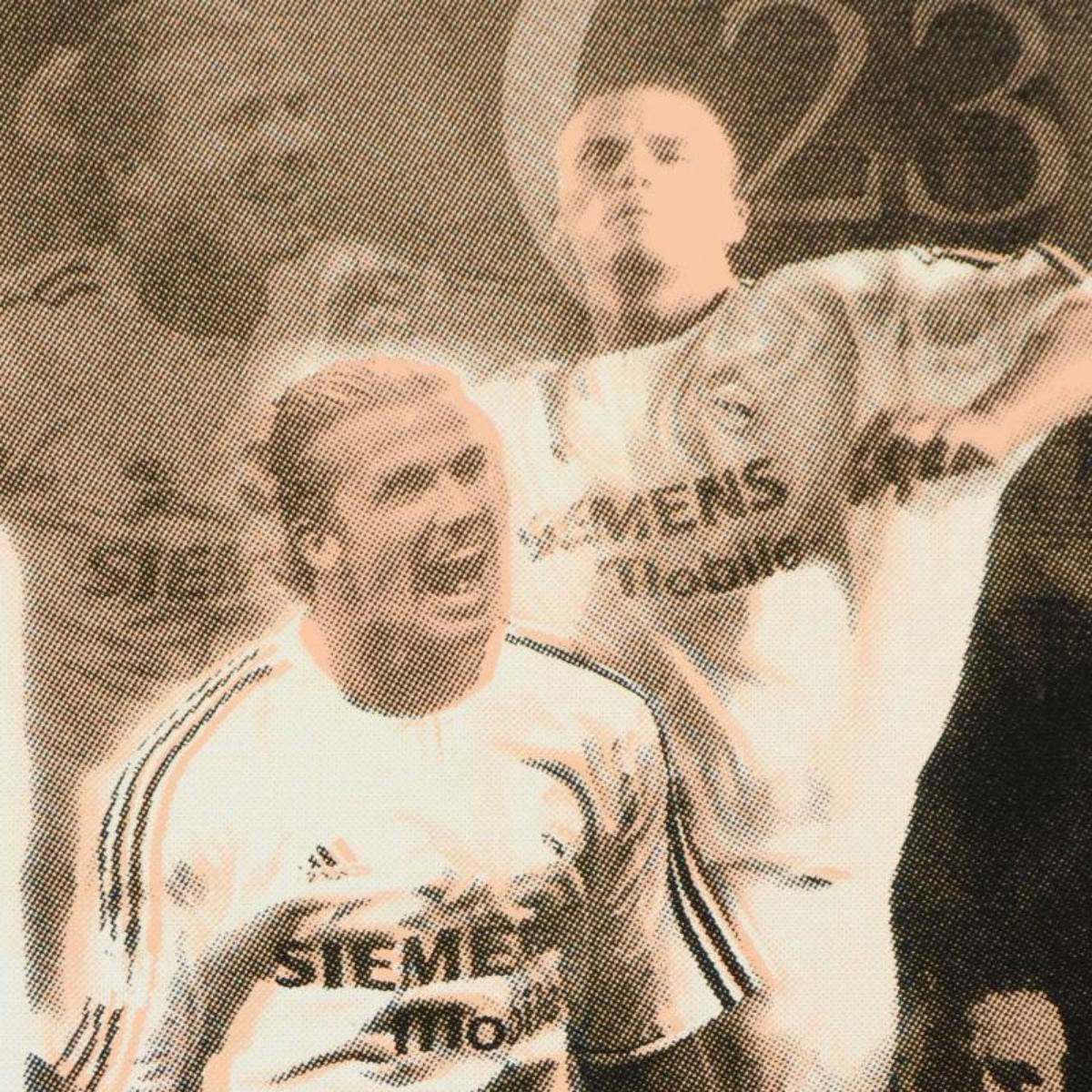 "David Beckham Pop Stamp" is a one-of-a-kind hand-pulled silkscreen on canvas by Ringo (Daniel Funes) - protege of Andy Warhol's apprentice, Steve Kaufman. This piece is hand signed by the artist and Includes Certificate of Authenticity. This piece comes from the Andy Warhol Legacy Series. Measures approx. 12" x 16" (image). ** Please note: the signature for this piece is located on the bottom-edge of the canvas and will only be visible if the piece is matted flat when framed; see photo for reference. ** Reference #: 229671