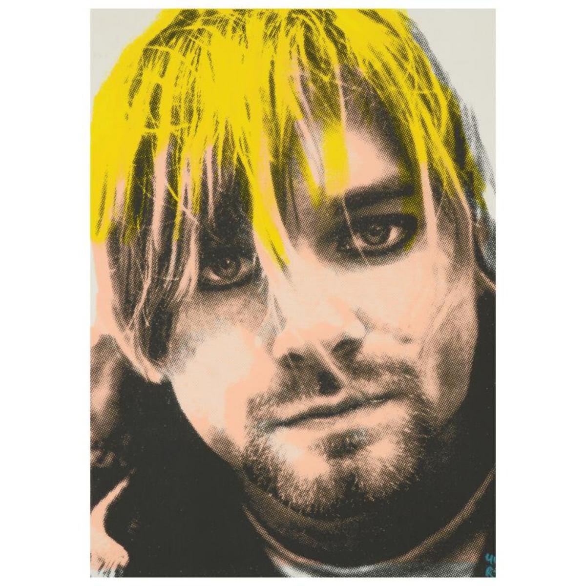 "Kurt's Music Notes (Cobain)" is a one-of-a-kind hand-painted mixed media on canvas by Ringo (Daniel Funes) - protege of Andy Warhol's apprentice, Steve Kaufman. This piece is hand signed by the artist and Includes Certificate of Authenticity. This piece comes from the Andy Warhol Legacy Series. Due to the nature of the canvas these, pieces will need to be mounted for framing. Measures approx. 12" x 16" (image). Please note: the right vertical border of the canvas was not cut on a precise right angle. As a result, the bottom corner where the signature is located laterally protrudes slightly further out than the top-right corner. Reference #: 229610