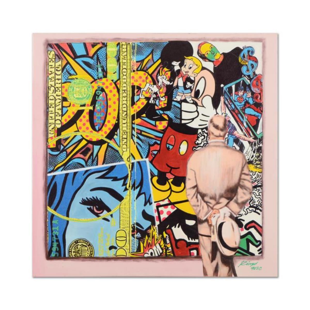 "Pop Collage II, Homage" is a hand-painted one-of-a-kind mixed media on canvas by Ringo (Daniel Funes) - protege of Andy Warhol's apprentice, Steve Kaufman. This piece is gallery wrapped. This piece is hand signed by the artist and Includes Certificate of Authenticity. Measures approx. 36" x 36" x 4" (image). Reference #: 238229