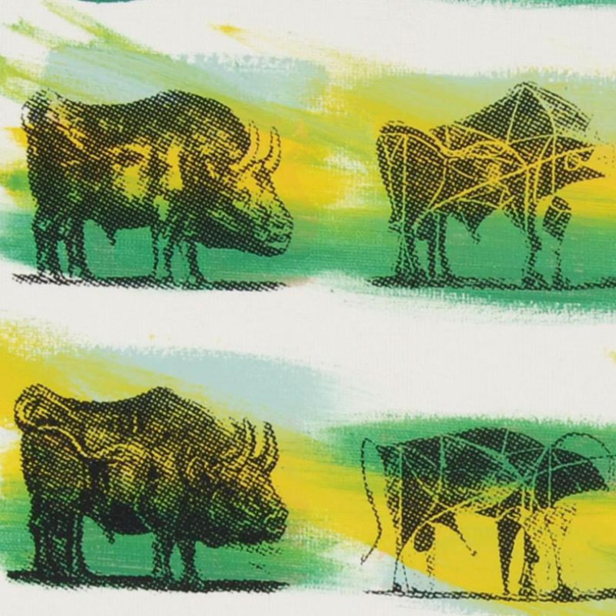 "Eleven Bulls (Picasso)" is a one-of-a-kind hand-pulled silkscreen and mixed media painting on canvas by Ringo. This piece is hand signed by the artist and comes from the Andy Warhol Legacy Series. Includes Certificate of Authenticity. Due to the nature of the canvas, these pieces will need to be mounted for framing. Measures approx. 17" x 11" (image). Reference #: 229095