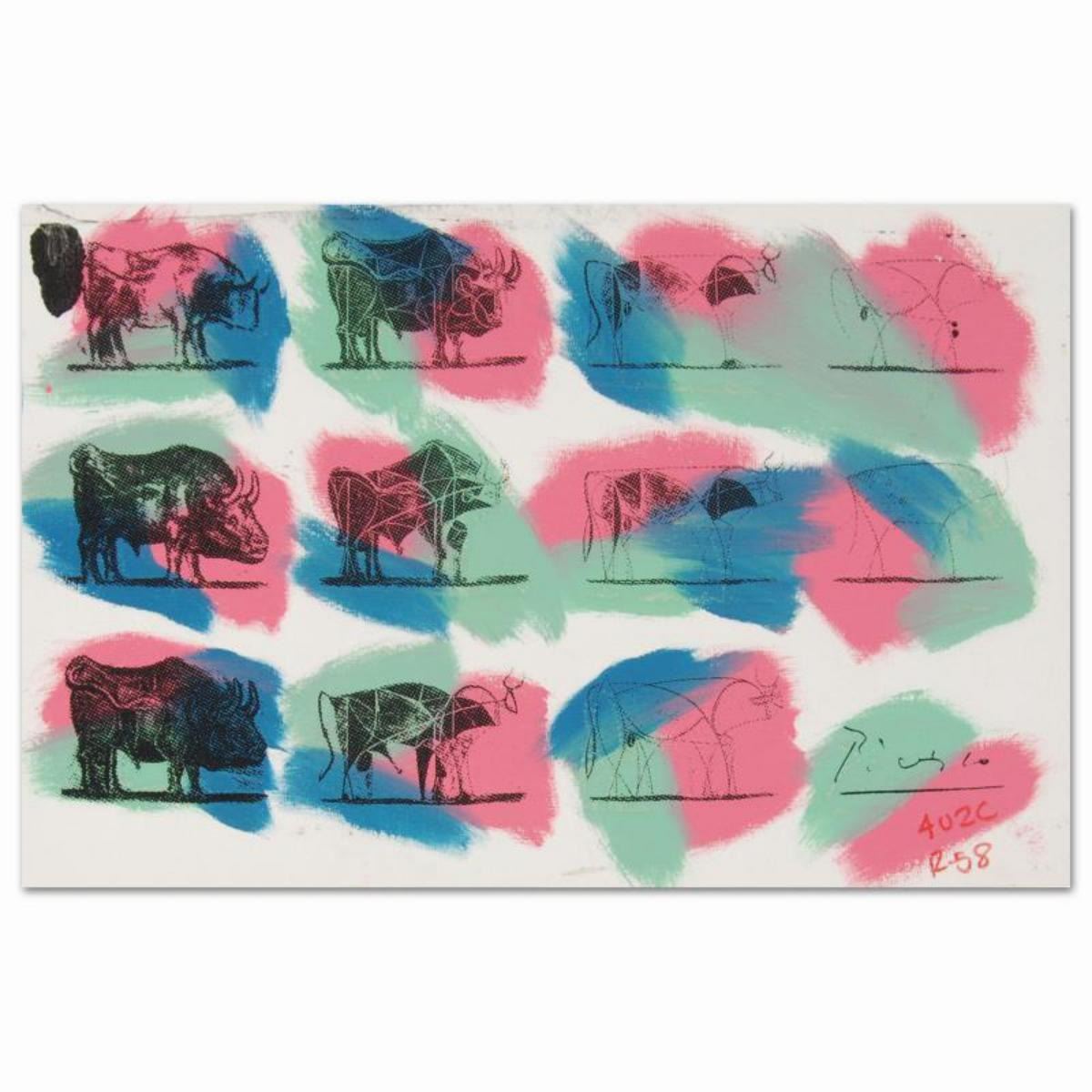 "Eleven Bulls (Picasso)" is a one-of-a-kind hand-pulled silkscreen and mixed media painting on canvas by Ringo. This piece is hand signed by the artist and comes from the Andy Warhol Legacy Series. Includes Certificate of Authenticity. Due to the nature of the canvas, these pieces will need to be mounted for framing. Measures approx. 17" x 11" (image). Reference #: 229099