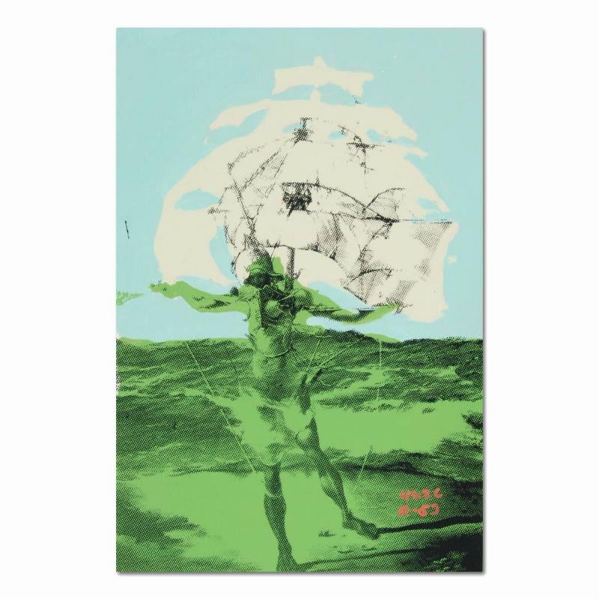 "Man Ship (Dali Homage)" is a one-of-a-kind hand-pulled silkscreen and mixed media painting on canvas by Ringo. This piece is hand signed by the artist and comes from the Andy Warhol Legacy Series. Includes Certificate of Authenticity. Due to the nature of the canvas, these pieces will need to be mounted for framing. Measures approx. 11" x 16" (image). Reference #: 229112