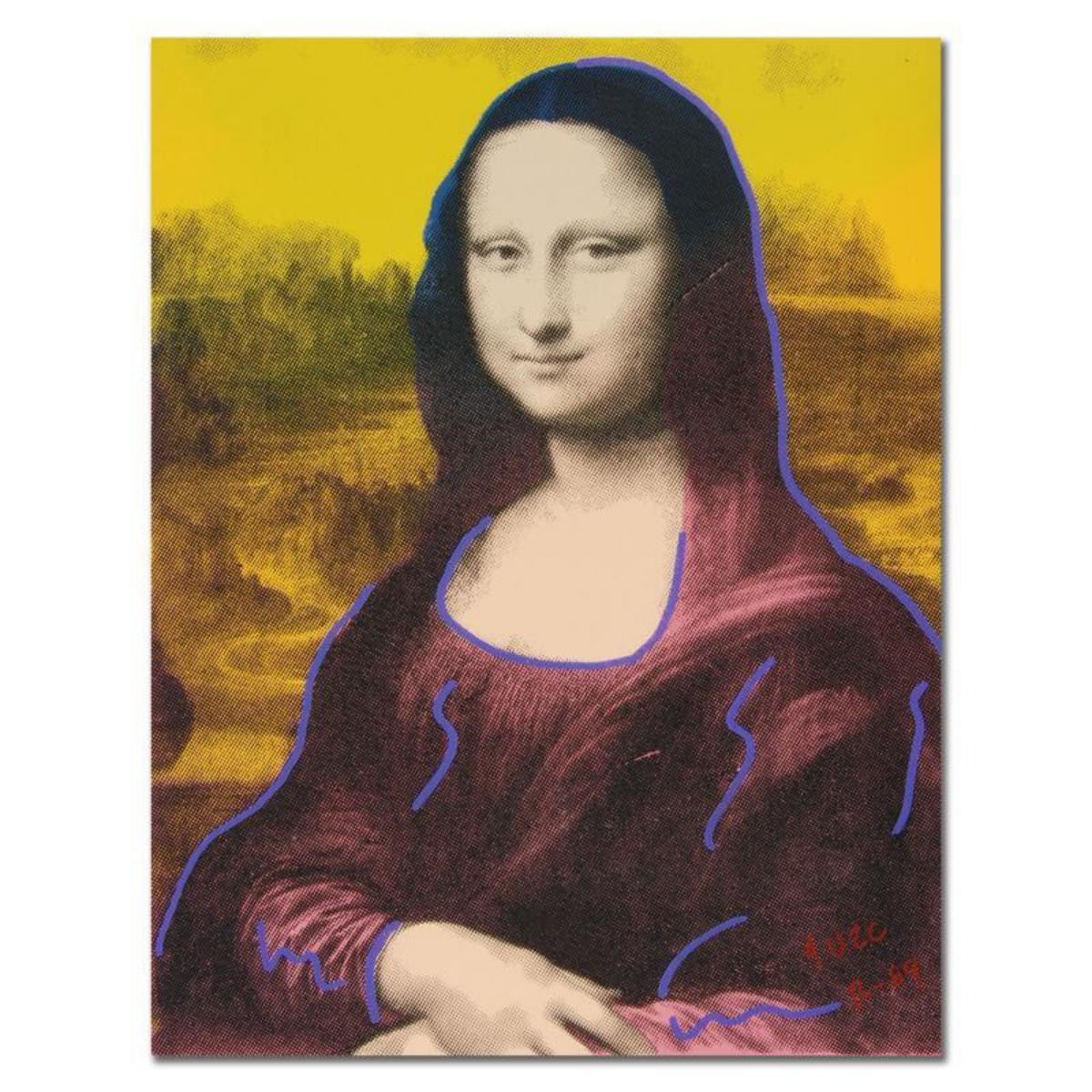 "Mona" is a one-of-a-kind hand-pulled silkscreen and mixed media painting on canvas by Ringo. This piece is hand signed by the artist and comes from the Andy Warhol Legacy Series. Includes Certificate of Authenticity. Due to the nature of the canvas, these pieces will need to be mounted for framing. Measures approx. 12" x 16" (image). Reference #: 229186