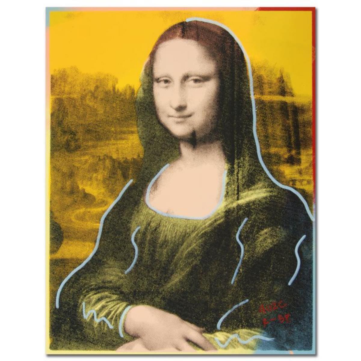 "Mona" is a one-of-a-kind hand-pulled silkscreen and mixed media painting on canvas by Ringo. This piece is hand signed by the artist and comes from the Andy Warhol Legacy Series. Includes Certificate of Authenticity. Due to the nature of the canvas, these pieces will need to be mounted for framing. Measures approx. 12" x 16" (image). ** Please note: There is a faint vertical crease through the image. ** Reference #: 229193