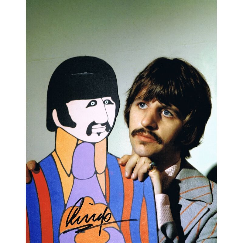 This autographed photo of Starr measures 10" x 8". The photograph shows the musician posing next to a cardboard cut out of a cartoon, designed in his likeness.
