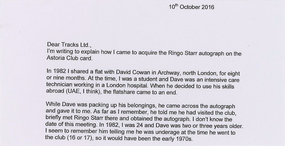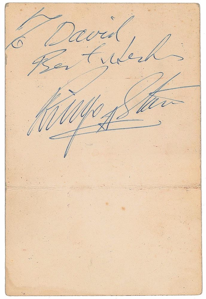 Ballpoint signature and inscription, "To David, Best wishes, Ringo Starr," on the reverse of an off-white 2.75 x 4.25 card for The Astor Club. In fine condition, with a fold not affecting the signature, and light staining on the face of the card. Accompanied by a full letter of authenticity from Tracks, as well as a letter of provenance, in part: "In 1982 I shared a flat with David Cowan in Archway…when he decided to use his skills abroad…the flatshare came to an end. While Dave was packing up his belongings, he came across the autograph and gave it to me. As far as I remember, he told me he had visited the club, briefly met Ringo Starr there and obtained the autograph…I seem to remember him telling me he was underage at the time he went to the club…so it would have been the early 1970s."