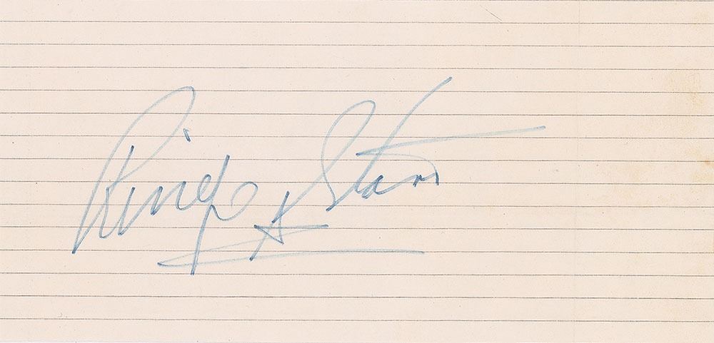 Felt tip signature, "Ringo Starr,” on an off-white 7.75 x 3.75 sheet of notebook paper. In fine condition, with intersecting folds. Accompanied by a certificate of authenticity from Tracks.