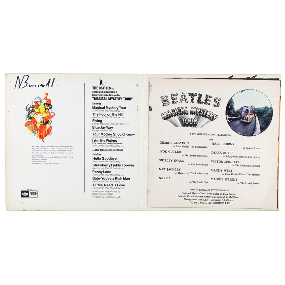 Magical Mystery Tour soundtrack album by the Beatles, signed inside on the inner gatefold in black felt tip by Ringo Starr. Upper right corner of front cover bears a "Specially imported by E.M.I. Records" label. In very good to fine condition, with light scuffing, and some light rippling to the mostly detached inner booklet. The record is included. The consignor notes that the signature was obtained at Ringo’s home ‘Sunny Heights’ in Weybridge, Surrey in 1968.