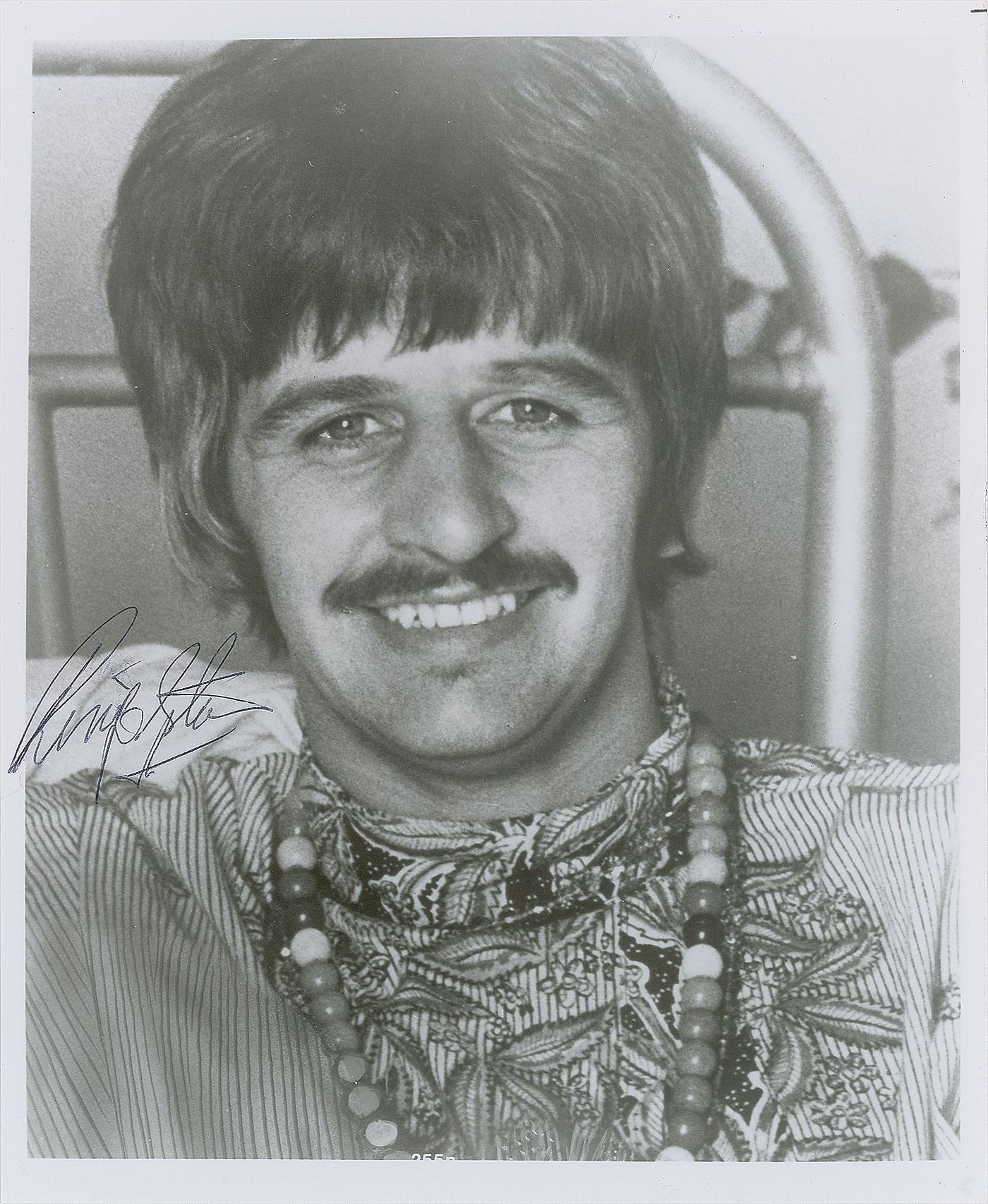 Glossy 8 x 9.75 close-up photo of Starr wearing beads and a floral shirt, signed in black ballpoint. In fine condition.