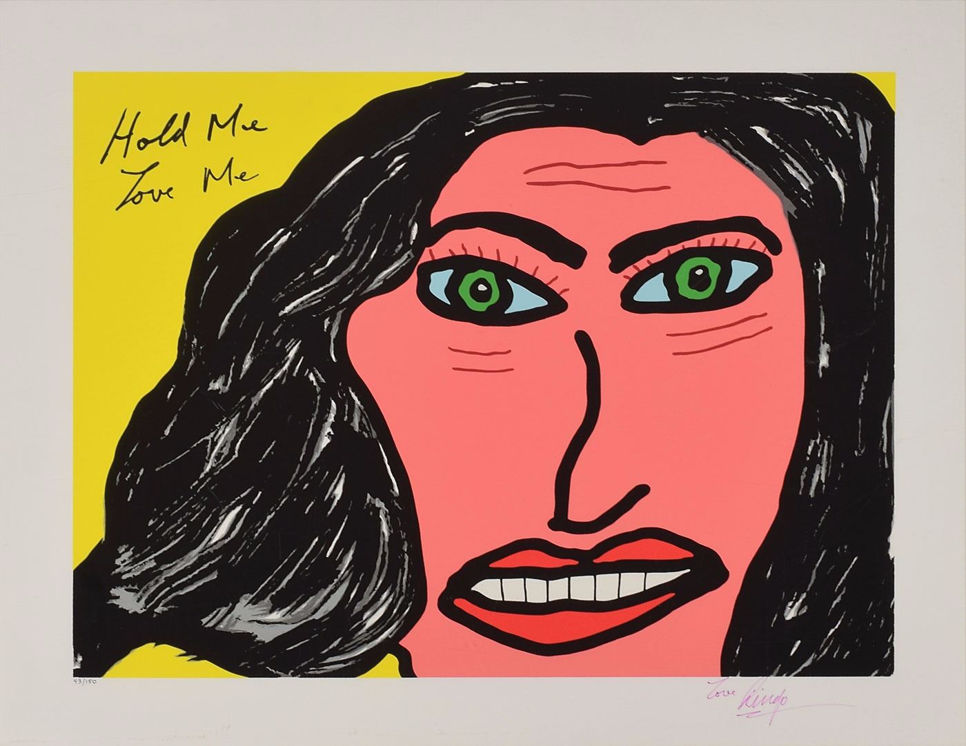 Color limited edition 27 x 21 serigraph print entitled 'Hold Me, Love Me,' numbered 43/150, signed in the lower border in pink felt tip, "Love, Ringo." Rolled and in fine condition.