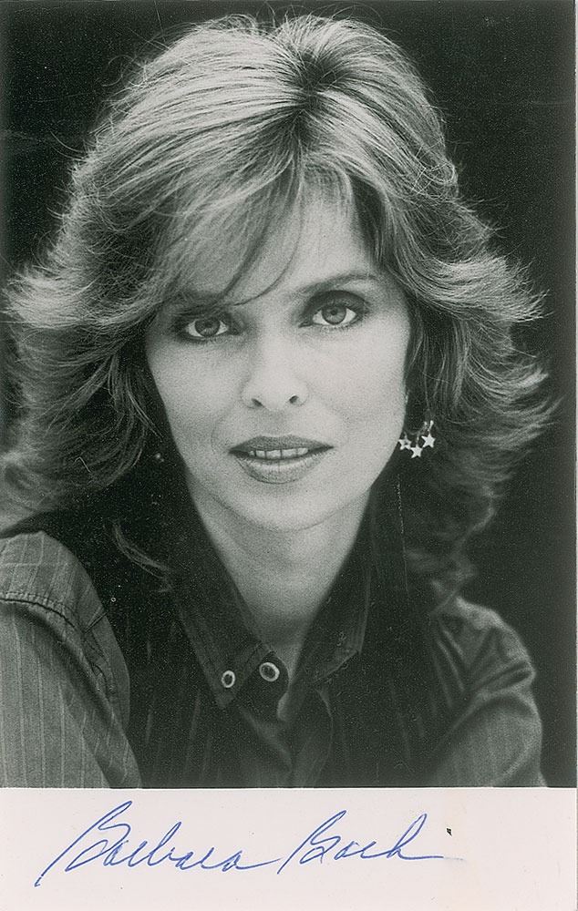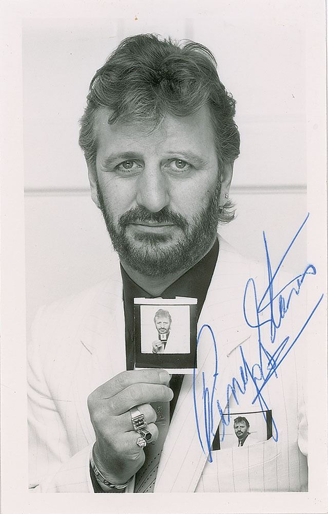 Two satin-finish 3.5 x 5.5 photos, one of Ringo Starr holding up a Polaroid photograph of himself, and the other of Barbara Bach in a front-facing pose, both signed in blue ballpoint. In overall very good to fine condition, with a crease above Ringo's head. Accompanied by a certificate of authenticity from Tracks.