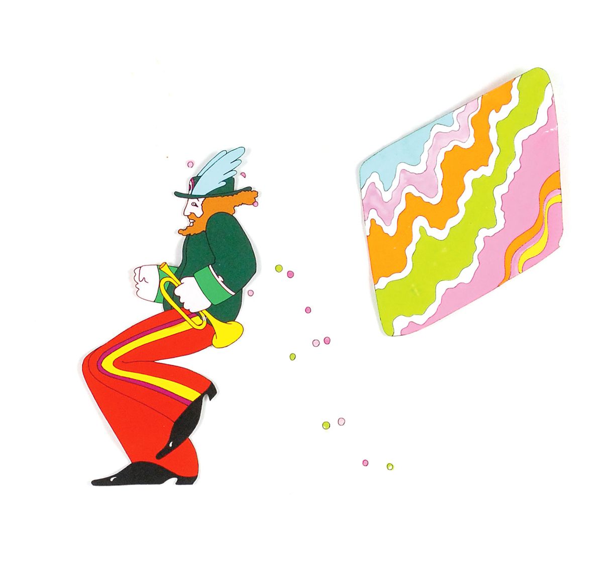 (United Artists/King Features, 1968) Original production cel featuring Ringo Starr from Yellow Submarine, showing him wearing a winged hat and followed by some dots and a psychedelic geometric shape. Total image measures 7 x 6, with an overall size of 16 x 12. In fine condition.