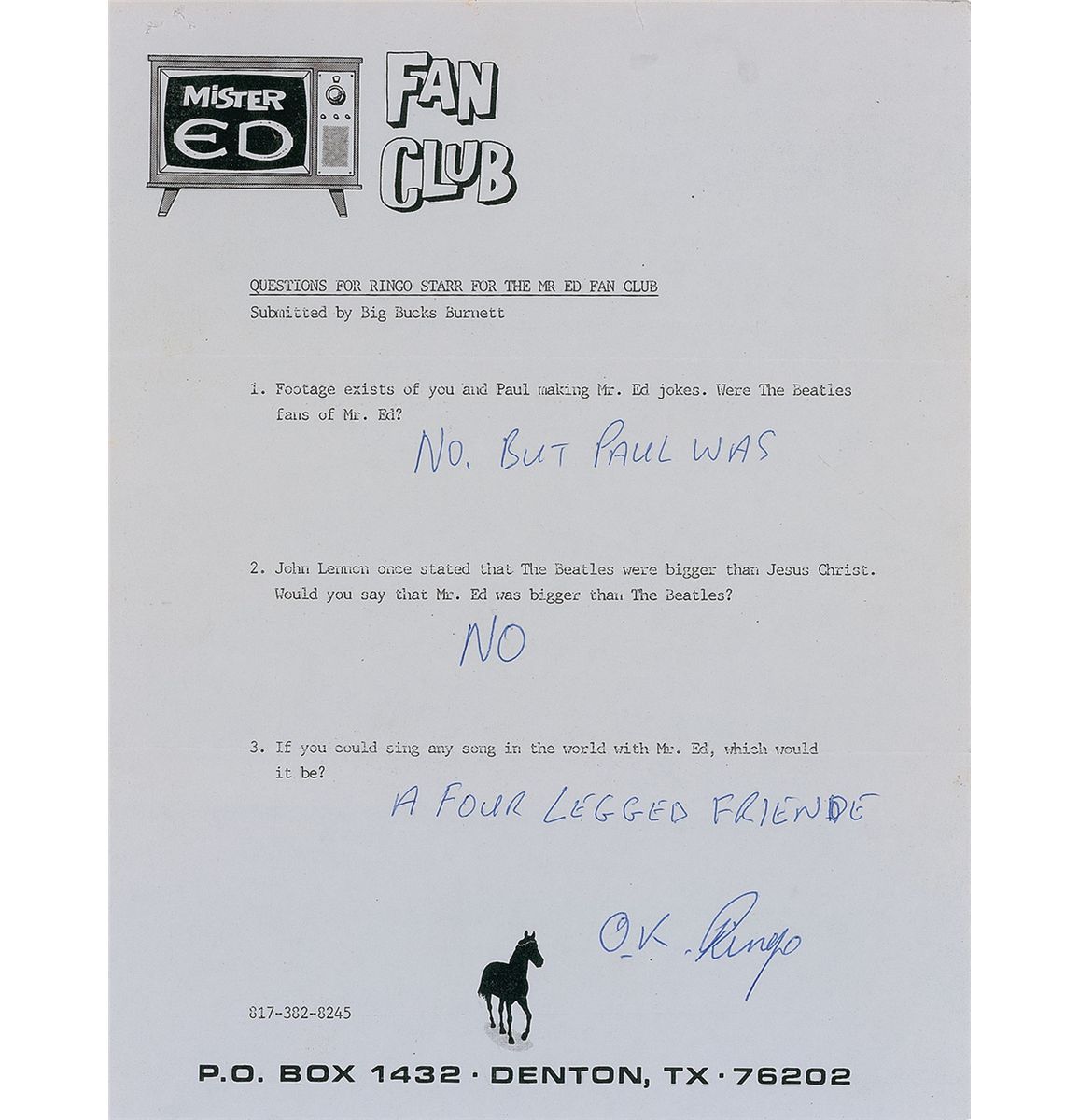 Humorous Mister Ed Fan Club questionnaire, 8.5 x 11, filled out by Ringo and signed at the conclusion, “O. K., Ringo.” Ringo answers the three posed questions, indicating that Paul McCartney was a Mr. Ed fan, Mr. Ed was not bigger than the Beatles, and that he would like to sing “A Four Legged Friende [sic]” with Mr. Ed. Two horizontal mailing folds, light scattered creases, staple holes to the upper left corner, and a small tear to the top, otherwise fine condition. A humorous and unique piece with a great association between icons of 1960s entertainment.
