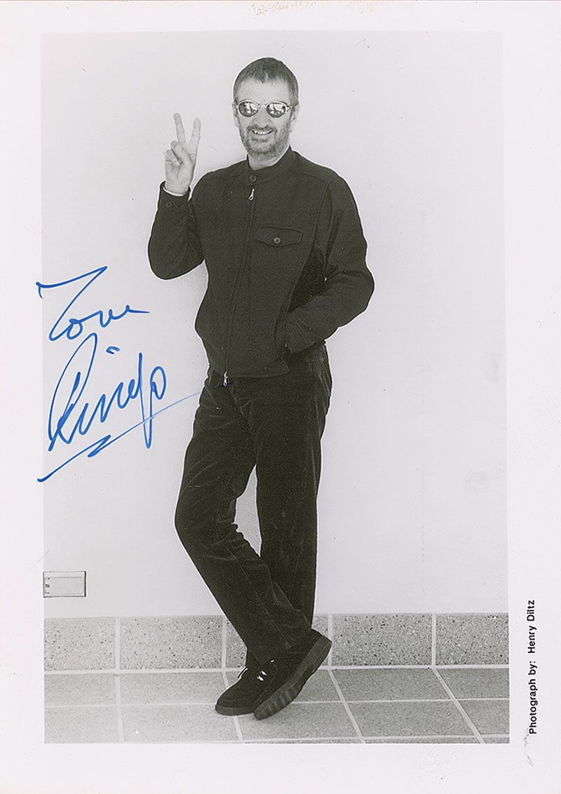 Satin-finish 5 x 7 full-length photo of Ringo giving a peace sign, signed in blue felt tip, “Love, Ringo.” In fine condition, with a few light bends and surface impressions and some light soiling to top border. Accompanied by a certificate of authenticity from Tracks.