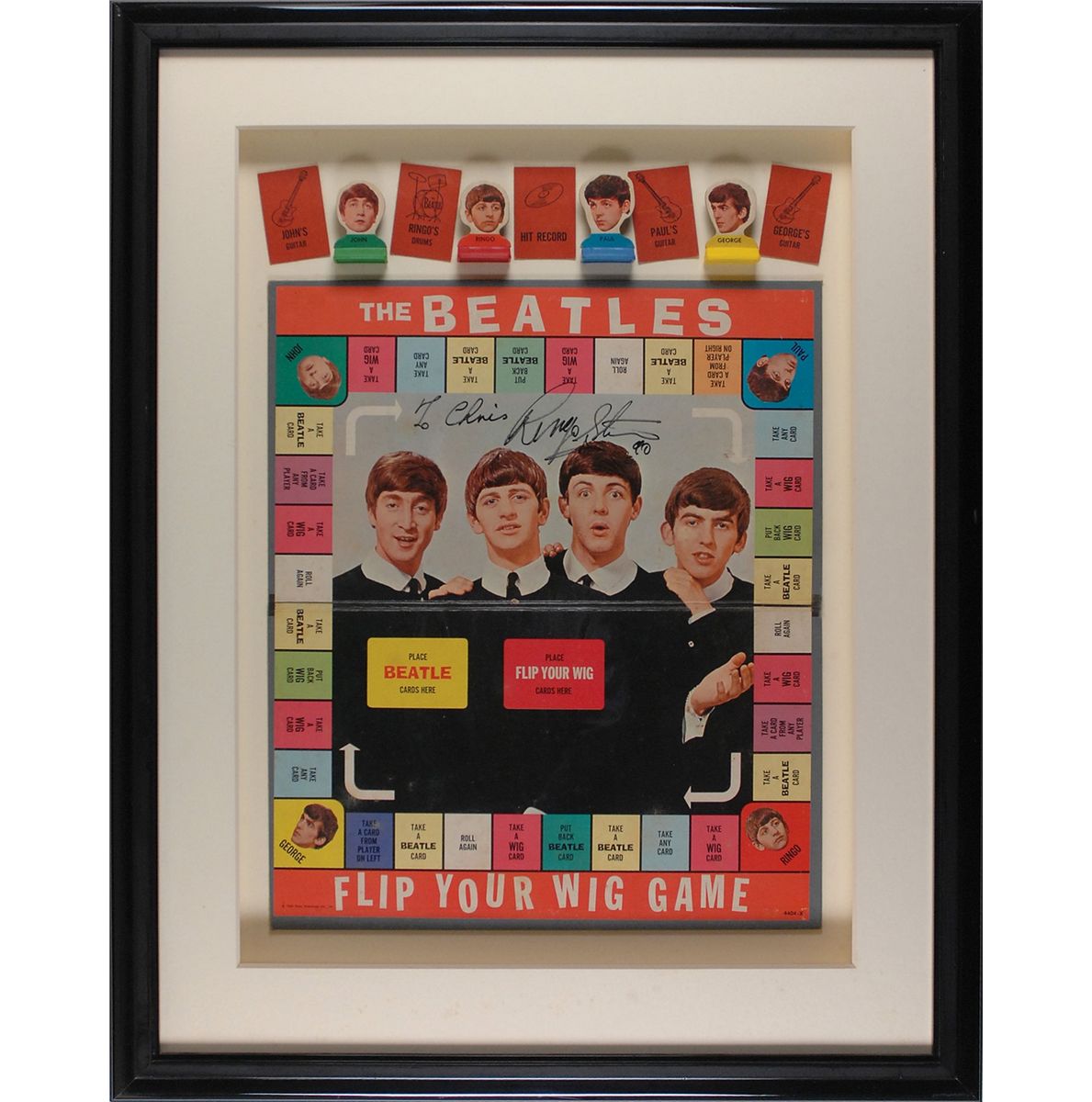 Original 1964 Beatles “Flip Your Wig” board game issued by Milton Bradley, 15.5 x 18, featuring a large image of the band, signed and inscribed in black felt tip, “To Chris, Ringo Starr ‘90.” Board is shadow-boxed and framed with the game’s four playing pieces and five cards to an overall size of 24.5 x 31. In fine condition, with some light wear to board. Accompanied by a letter of authenticity from noted Beatles expert Frank Caiazzo.