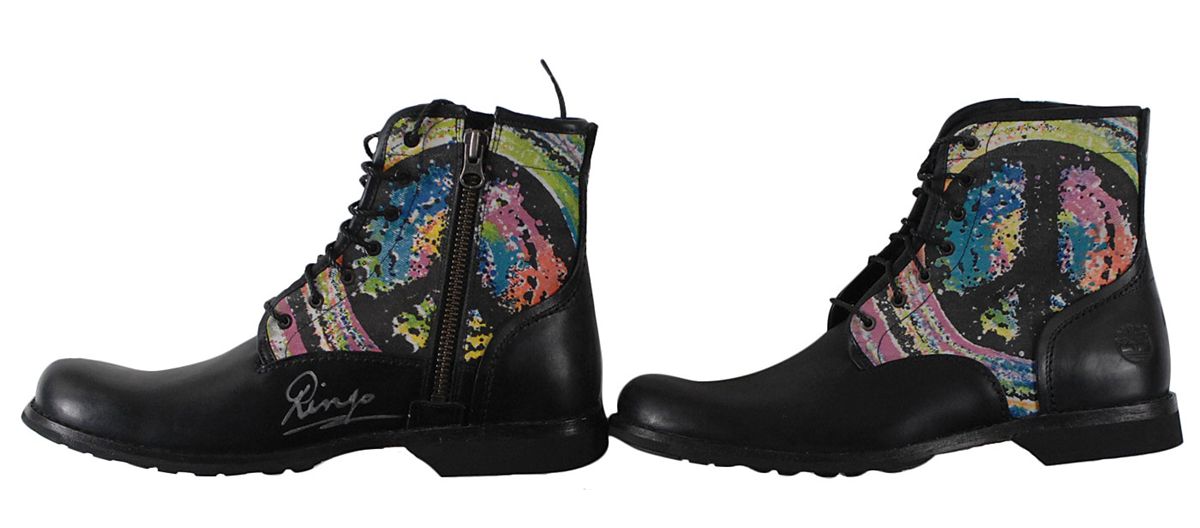 Pair of limited edition Timberland Earthkeeper boots featuring a design by Ringo, numbered 27/75, signed on the instep of the right boot in silver ink, “Ringo.” Includes the original Timberland box. In very fine condition. Accompanied by a certificate of authenticity from Tracks. Ringo designed these boots exclusively for the WaterAid charity, releasing them in his own size 8.