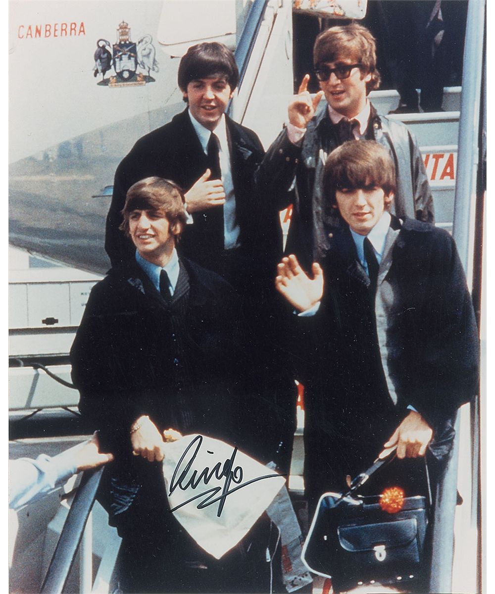 Color glossy 8 x 10 photo of the Beatles descending from a plane, thoughtfully signed over a light area of his luggage in black felt tip, “Ringo.” In very fine condition. Accompanied by a certificate of authenticity from Roger Epperson/REAL.