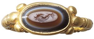Rings. An agate intaglio ring. Roman, Balkan region, circa 2nd - 3rd century AD. D/ The oval stone depicting a dolphin. The round and knobbed gold hoop joined to the oval bezel, two gold pairs of globules soldered to the junctions on either side.