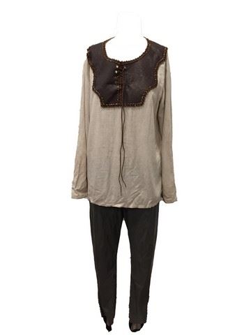 Rings of Power (2022) - Elrond (Robert Aramayo) test cream tunic shirt with pleather shoulders and pleather brown pants. The costume was never worn in the film, but it was used by the filmmakers to test the look and feel of it before they made the final version.