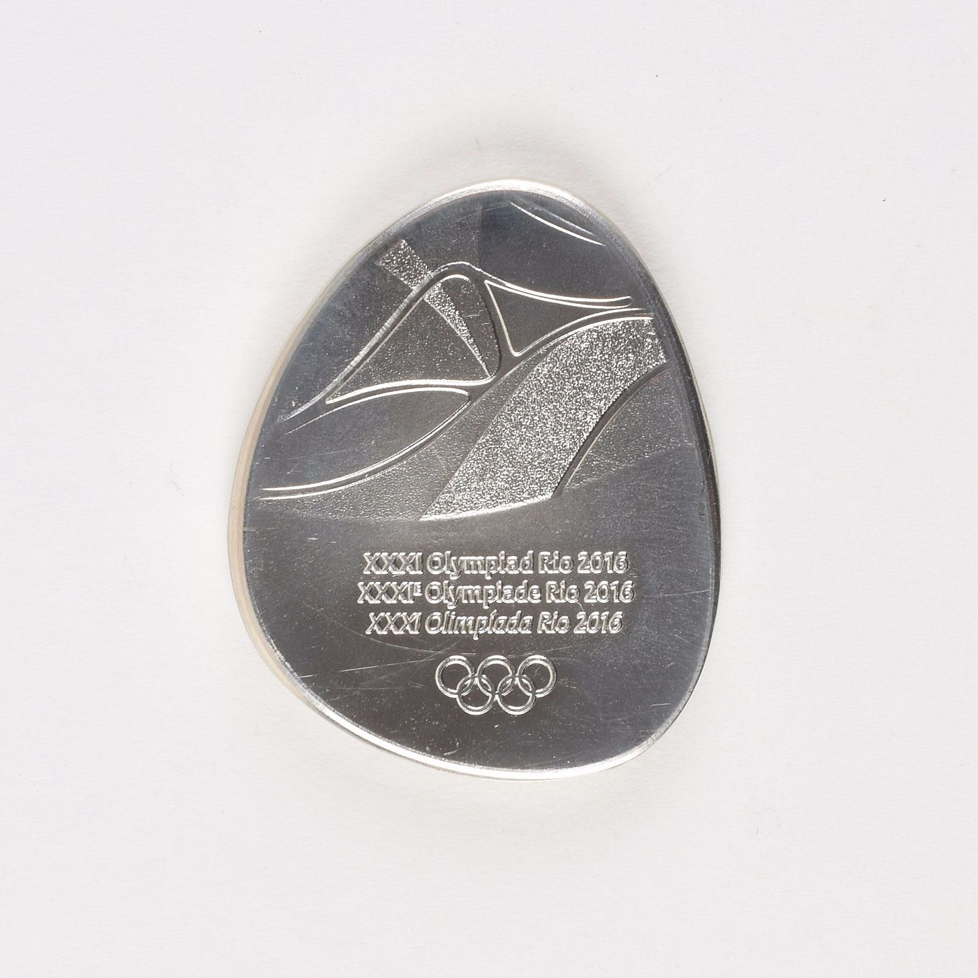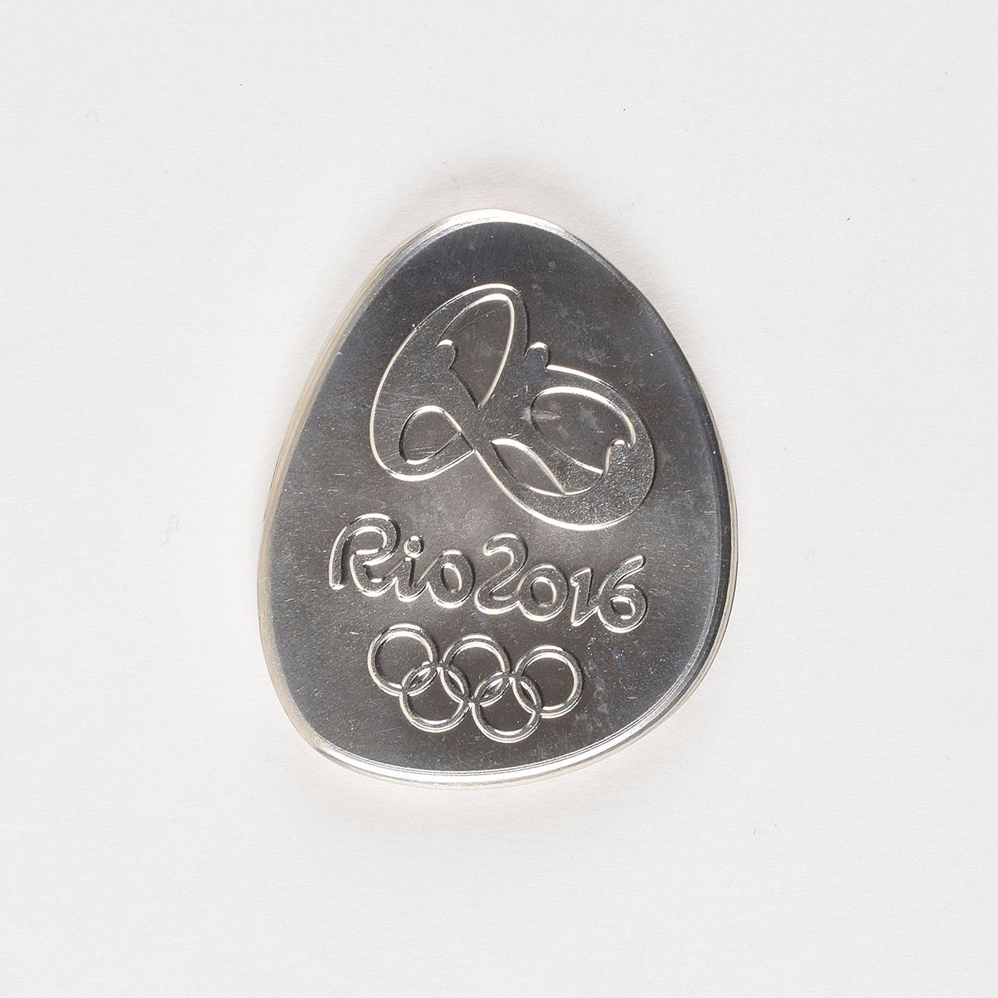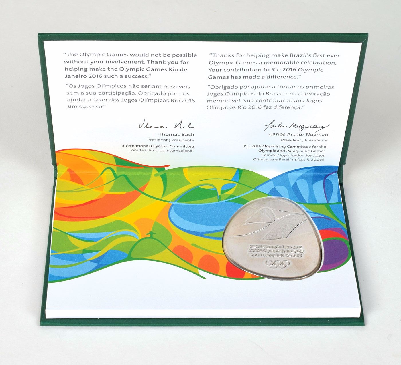 Participation medal of the Rio 2016 Summer Olympic Games. Alloy copper, 44 mm x 53 mm, 89 gm. The front features the Rio Games logo above Olympic rings; the reverse bears flowing designs above three rows of raised text, “XXXI Olympiad Rio 2016.” Includes its presentation folder with slipcase.