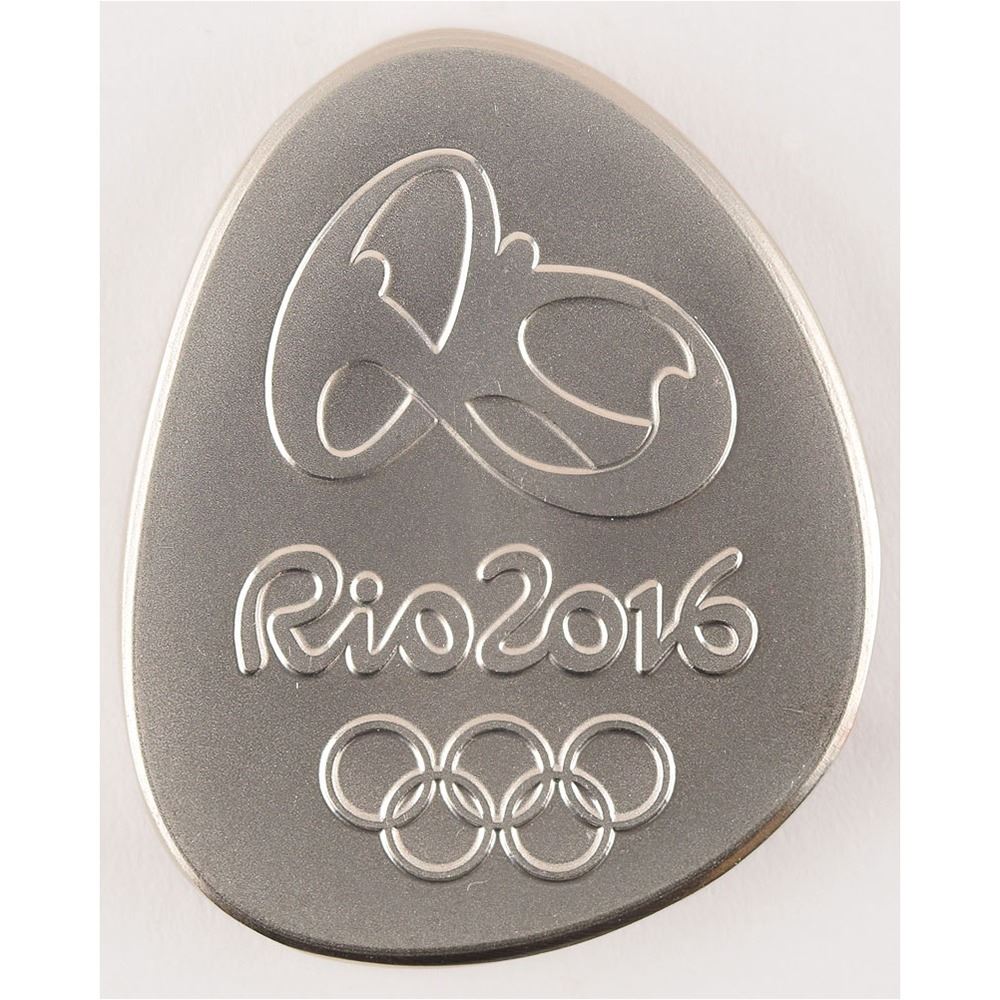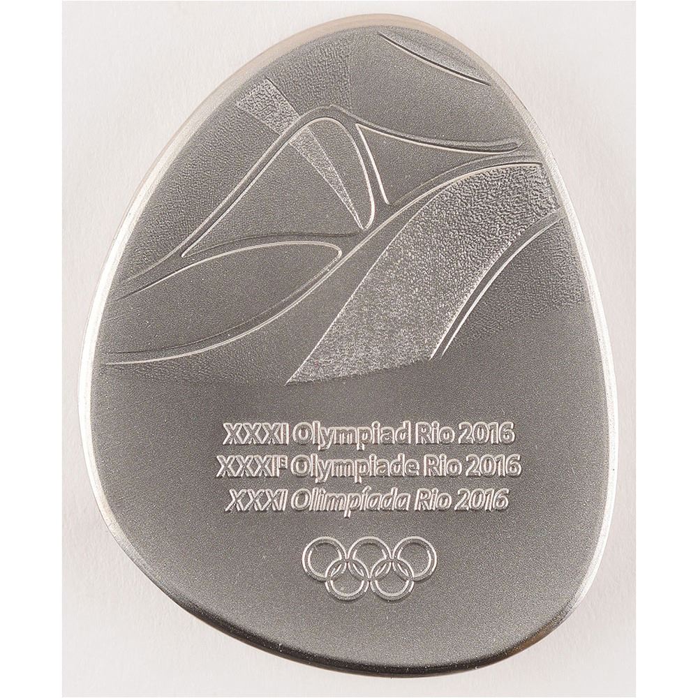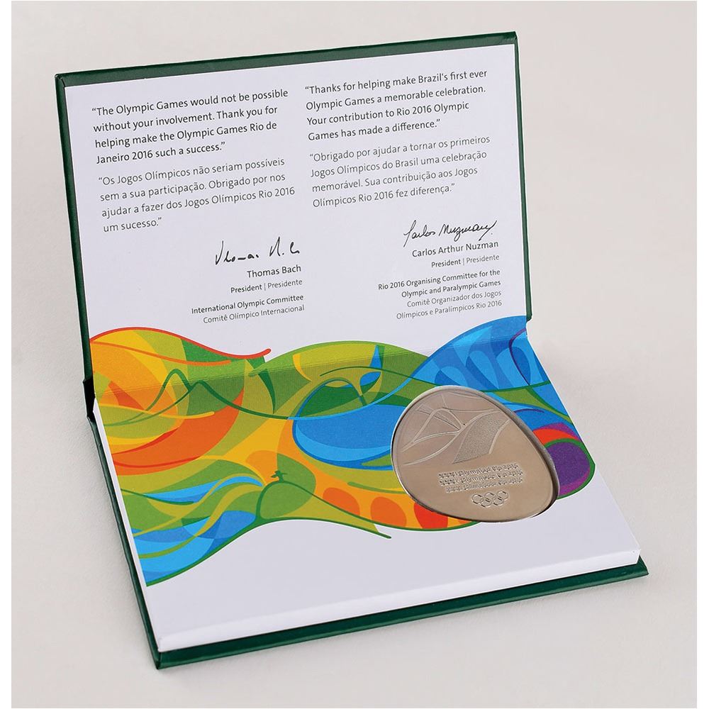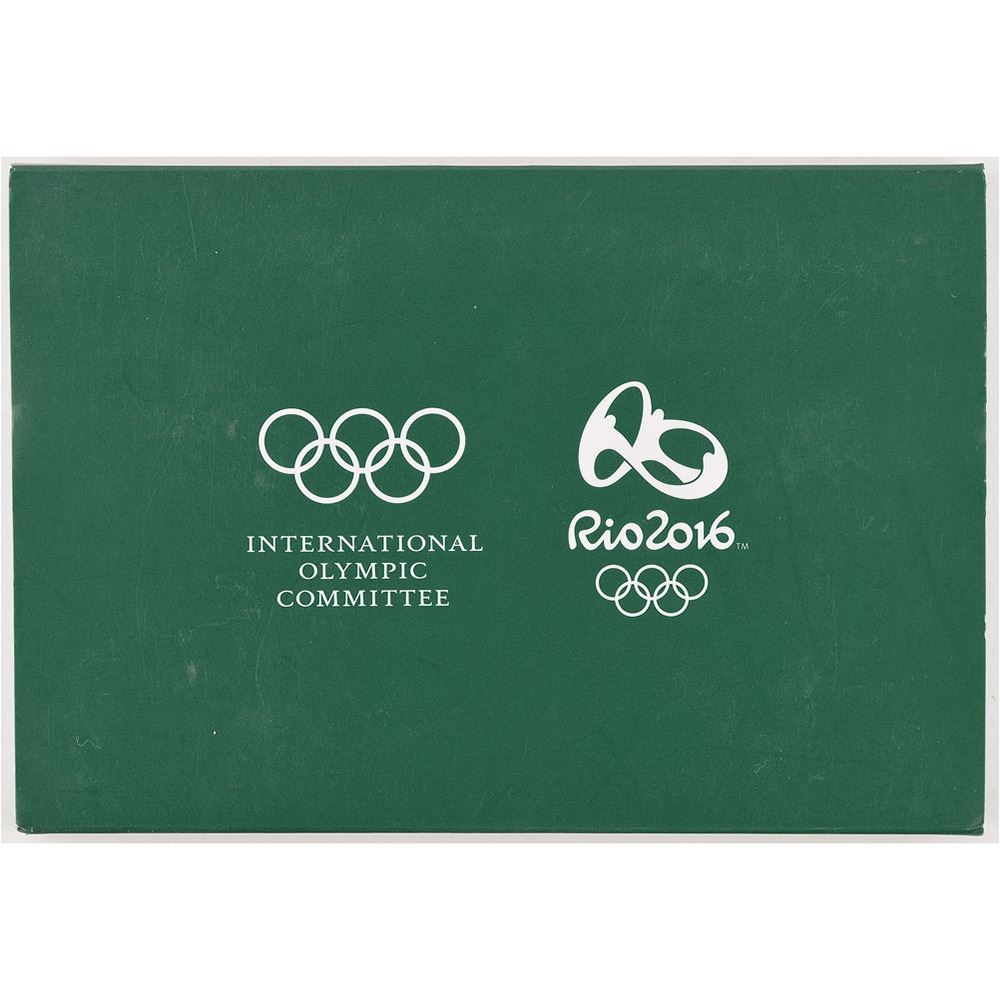 Participation medal of the Rio 2016 Summer Olympic Games. Alloy copper, 44 mm x 53 mm, 89 gm. The front features the Rio Games logo above Olympic rings; the reverse bears flowing designs above three rows of raised text, “XXXI Olympiad Rio 2016.” Includes its presentation folder with slipcase, with some slight scuffing to the latter.