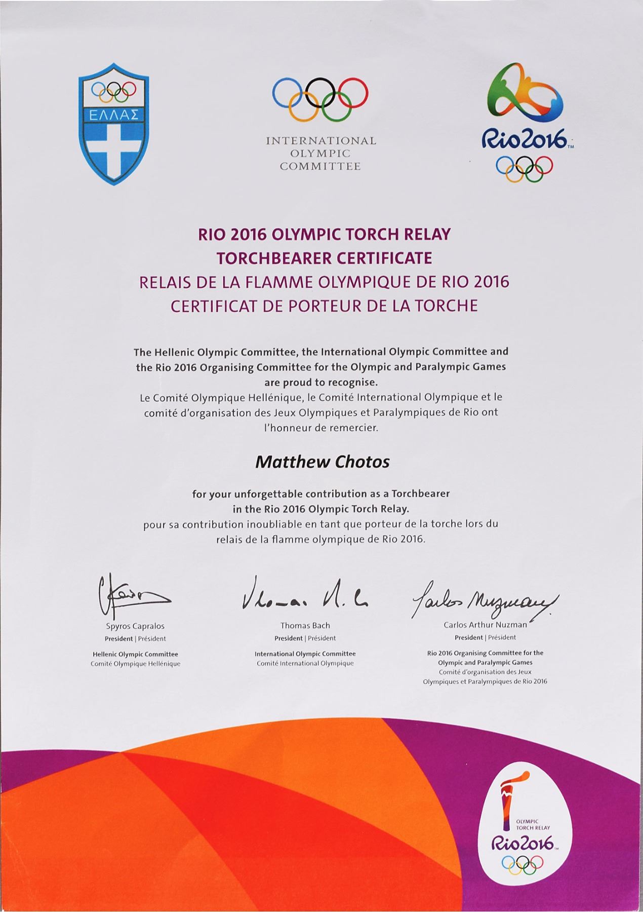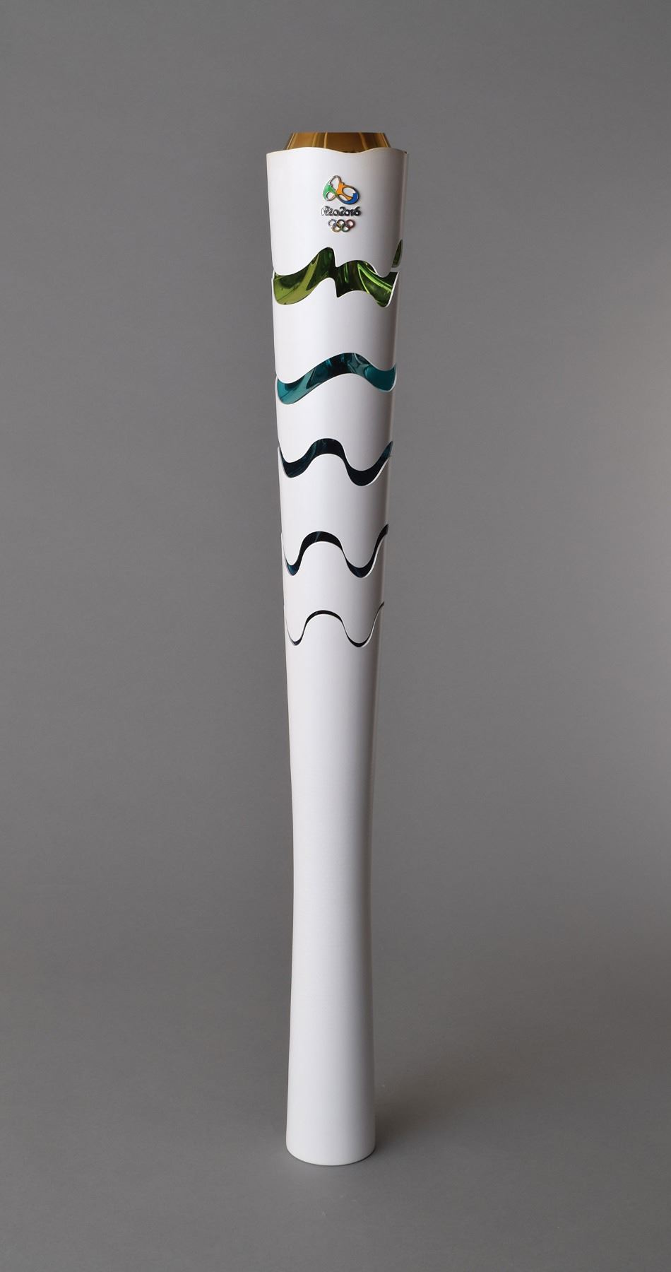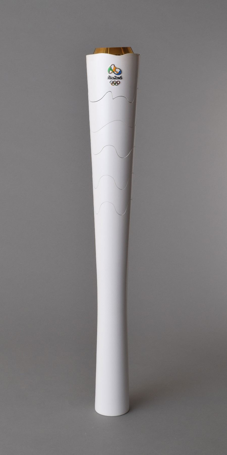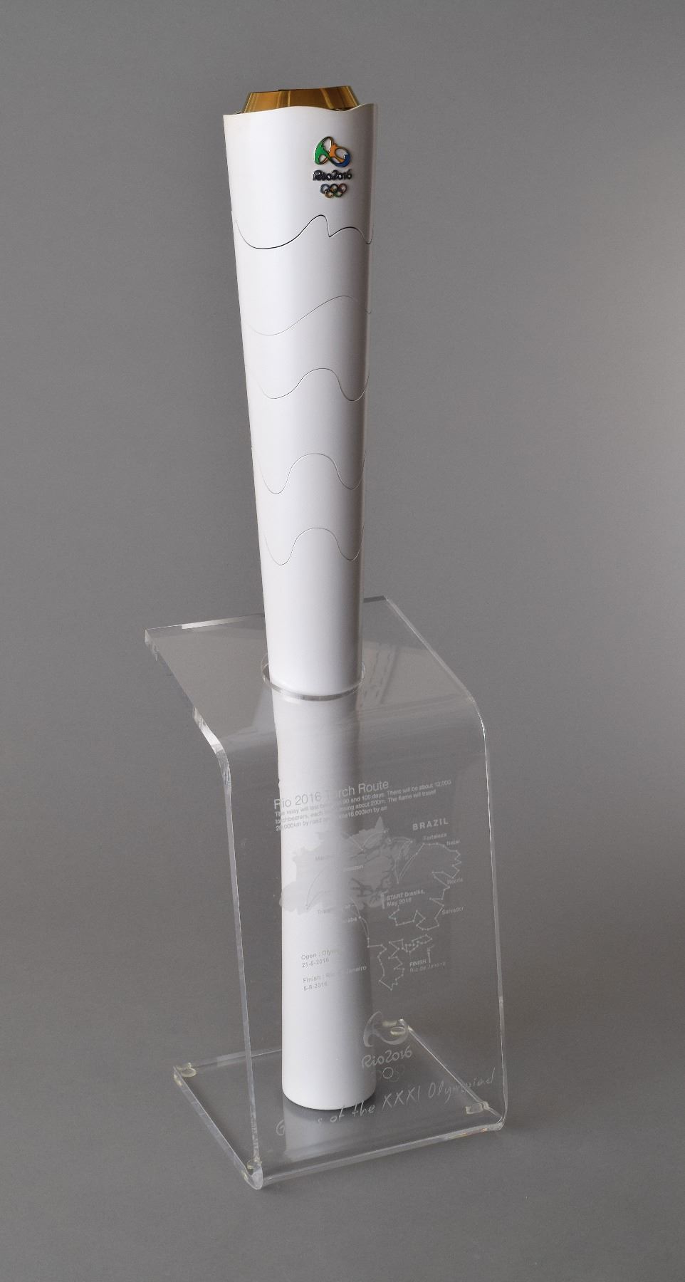 Official 2016 Rio de Janeiro Summer Olympics torch, constructed of recycled aluminum and colored resin, measuring 27? in length and 3.5? at its widest point, designed by Sao Paulo studio Chelles & Hayashi and manufactured by Recam Laser. The torch features a white body that automatically expands upon being lit to reveal multicolored segments drawn from the hues of the Brazilian flag, representing the natural wonders surrounding the host city. The Rio Olympic emblem also adorns the top. Includes the original brown carrying bag, tube (top cap missing), a custom-made display stand featuring details of the Rio relay itinerary and a map, and an official Rio 2016 certificate of authenticity issued to torchbearer Matthew Chotos. The torch relay began in Olympia on April 21, and concluded on August 5 at Maracanã Stadium in Rio de Janiero, after visiting over three hundred of Brazil's towns and cities. A record number of countries participated in the Rio Games, including first time entrants Kosovo and South Sudan. Ten thousand and nine hundred athletes participated in 306 medalling events of 45 sports disciplines. A rare opportunity to own a relay torch from the most recent Summer Olympic games.