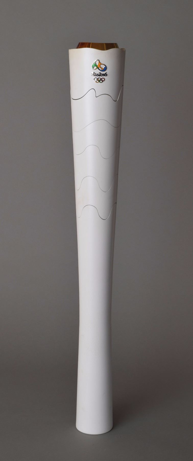 Official 2016 Rio de Janeiro Summer Olympics torch used during the Olympic relay, constructed of recycled aluminum and colored resin, measuring 27? in length and 3.5? at its widest point, designed by Sao Paulo studio Chelles & Hayashi and manufactured by Recam Laser. The torch features a white body that automatically expands upon being lit to reveal multicolored segments drawn from the hues of the Brazilian flag, representing the natural wonders surrounding the host city. The Rio Olympic emblem also adorns the top. Includes the original brown drawstring carrying bag, tube, display stand, and official Rio 2016 memorabilia folder, which includes a certificate of authenticity.