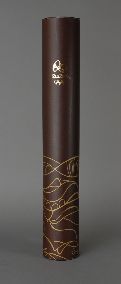 Official 2016 Rio de Janeiro Summer Olympics torch, constructed of recycled aluminum and colored resin, measuring 27? in length and 3.5? at its widest point, designed by Sao Paulo studio Chelles & Hayashi and manufactured by Recam Laser. The torch features a white body that automatically expands upon being lit to reveal multicolored segments drawn from the hues of the Brazilian flag, representing the natural wonders surrounding the host city. The Rio Olympic emblem also adorns the top. Includes the original brown carrying bag, tube, and a custom-made display stand featuring details of the Rio relay itinerary and a map. This torch was used during the Greek leg of the relay, which began in Olympia on April 21 and lasted for one week. After a brief stop in Switzerland, the Olympic flame arrived in Brazil on May 3 and will visit over three hundred of the nation’s towns and cities. The relay will conclude when the last torchbearer lights the Olympic cauldron during the opening ceremony at Maracana Stadium on August 5 to officially begin the Rio 2016 Summer Olympic Games. An exceedingly rare opportunity to own an Olympic torch prior to the conclusion of the relay.