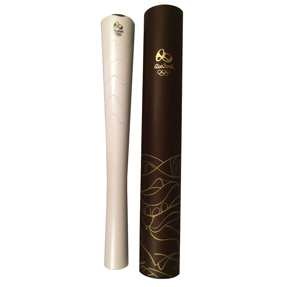 Unused official 2016 Rio de Janeiro Summer Olympics torch used during the Olympic relay, constructed of recycled aluminum and colored resin, measuring 27″ in length and 3.5″ at its widest point, designed by Sao Paulo studio Chelles & Hayashi and manufactured by Recam Laser. The torch features a white body that automatically expands upon being lit to reveal multicolored segments drawn from the hues of the Brazilian flag, representing the natural wonders surrounding the host city. The Rio Olympic emblem also adorns the top. Includes the original presentation tube.