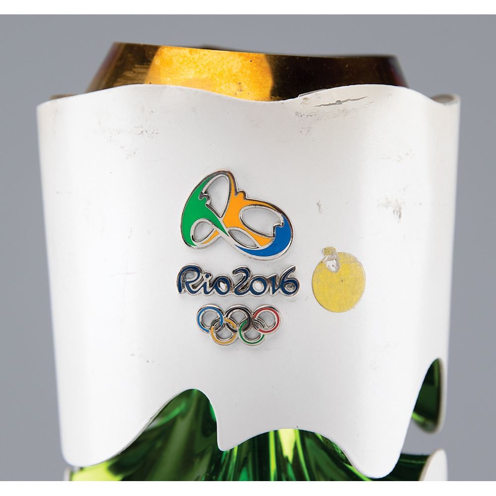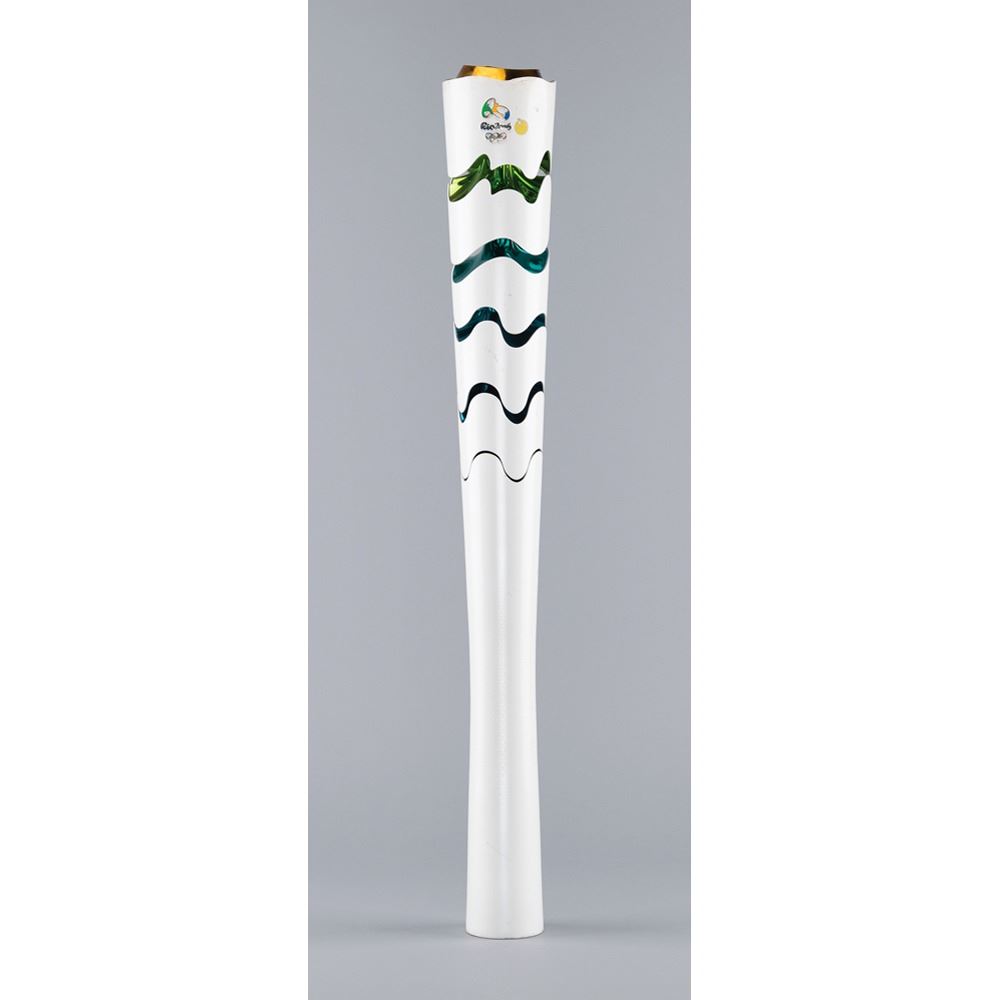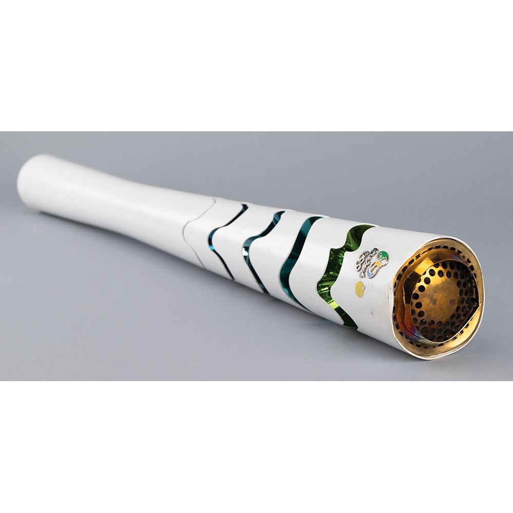 Official 2016 Rio de Janeiro Summer Olympics torch used during the Olympic relay, constructed of recycled aluminum and colored resin, measuring 27″ in length and 3.5″ at its widest point, designed by Sao Paulo studio Chelles & Hayashi and manufactured by Recam Laser. The torch features a white body that automatically expands upon being lit to reveal multicolored segments drawn from the hues of the Brazilian flag, representing the natural wonders surrounding the host city. The Rio Olympic emblem also adorns the top, and a small label numbered "005" is affixed to bottom of handle. The torch bears scattered overall marks and scuffs to the body, and some light dings and dents to the upper rim and burner.