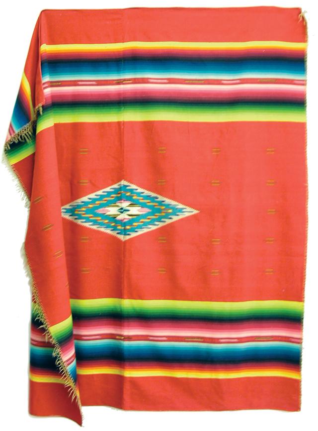Early/Mid 1900s, Vintage, extra finely woven blanket, deep red with central diamond motif, center seam, and colorful striped top and bottom borders. 3'10" x 6'3"
