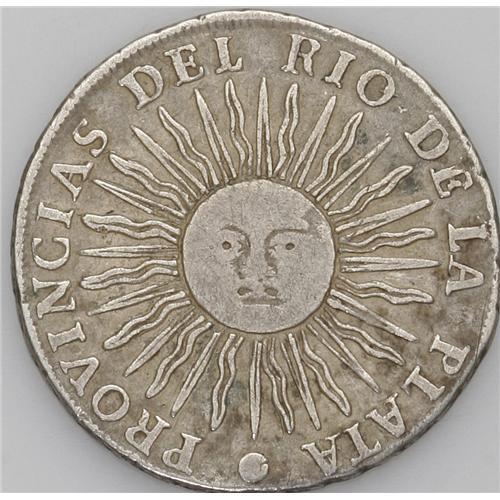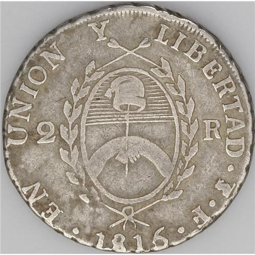 <B>Rio de la Plata. 2 Reales 1815F-PTS, </B></I>KM3, nice lightly toned F-VF, scarce quality for this denomination.<BR><I>From The Rio De La Plata Collection.</B></I>